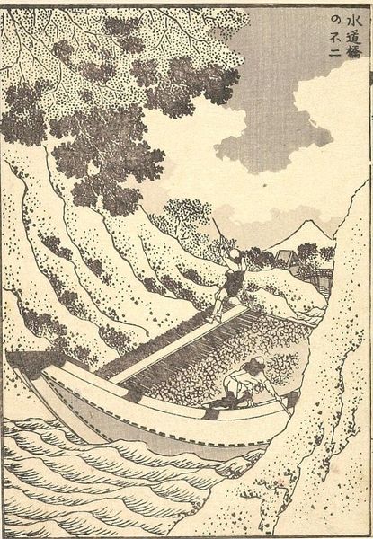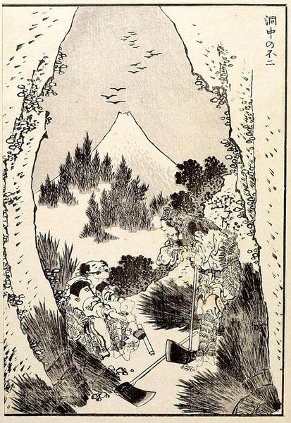 Curator: Here we have Katsushika Hokusai's "Fuji over a Waterfall," a detached page originating from his "One Hundred Views of Mount Fuji, Vol. 3." Editor: My first impression is the sheer weight of everyday life depicted against the sublime backdrop of nature. There's a tension here. Curator: Indeed. The waterfall acts almost as a curtain, partially revealing Fuji, a symbol of permanence. The human figures represent the transient nature of existence. Note how their path seems arduous. Editor: Right, this isn't just a landscape; it's a commentary on labor, perhaps even class. The figures are burdened, while Fuji remains untouched by their struggles. The birds overhead feel like a flock of aspirations or perhaps anxieties. Curator: Hokusai masterfully uses the waterfall as a dividing line, separating the mundane from the sacred, but always in relation to one another. He invites us to contemplate the divine through the lens of the everyday. Editor: Absolutely. And considering the context of its creation, amidst social and economic shifts in Japan, it’s hard not to read this image as a reflection on the changing relationship between people, land, and power. I find it strangely moving. Curator: Yes, Hokusai manages to capture both the timeless and the timely within this single frame. Editor: It's a stark reminder of the enduring power dynamics present even in the most beautiful landscapes. Thank you for pointing that out.