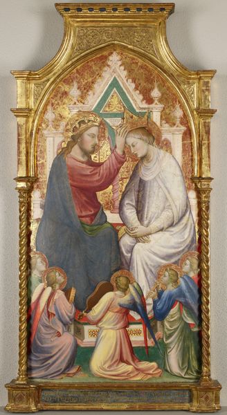 Editor: This panel painting from 1453 by Álvaro Pires de Évora depicts the Virgin Mary and St. John the Evangelist. It looks to be tempera on panel. I'm struck by the gold background and the rather somber mood. How should we interpret the choices in materials and presentation? Curator: Note how tempera allowed for those sharp lines, and that deliberate, flattened space emphasizes the here and now of religious experience as an active social and economic process. Think about who commissioned this. What sort of patron valued such obvious materiality? Editor: I see what you mean. It’s not about illusionism, but about declaring its own making. The gold leaf isn't trying to mimic light; it’s proclaiming value, wealth. Curator: Precisely. And look closely at the rendering of Mary's cloak – the intense blue pigment was extraordinarily expensive to source. Its ultramarine richness isn’t merely decorative; it's a statement about the investment in creating sacred imagery as a trade and cultural touchstone. Do you think the patrons appreciated such a visible expenditure? Editor: I imagine it signaled their own piety and status, a visual transaction with the divine and the earthly community. Curator: Exactly! So we have materials, artistic labour, religious messaging, and economic power all coalescing. Early Renaissance art, especially in panels like these, shows a very intentional connection between craft, consumption, and belief. Editor: That makes the somber mood more intriguing – it is less about sorrow and more about a deliberate display of constructed piety. I didn’t see that at first. Curator: Analyzing art through materials really opens up some fascinating lines of thought, doesn’t it? Editor: It does. I’ll definitely look at paintings differently now, thinking more about their physical presence as an assertion of labor, cost, and place within society. Thanks!