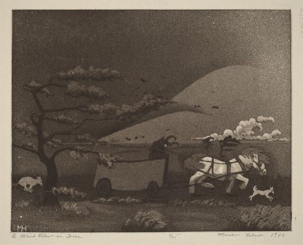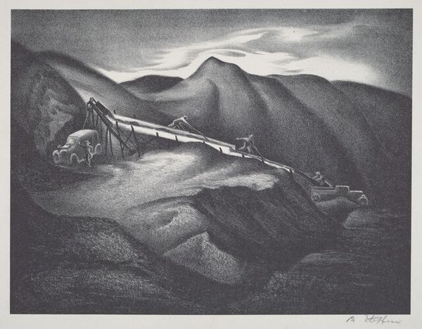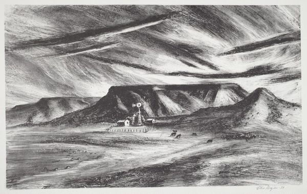 Alfred Wands created this lithograph, ‘Homeward,’ in the middle of the 20th century. The work is dominated by a monochromatic palette and the interplay of light and shadow, creating a mood that is both pastoral and slightly melancholic. Wands has structured the composition around the formal qualities of line and tone. The strong horizontal lines of the landscape and the mountains provide a stark contrast to the softer, more diffuse shading of the sky. This tension between line and tone invites a semiotic reading, where the sharp lines could symbolize structure and constraint, while the tonal gradations suggest fluidity and change. The figure and cow are rendered with simplified forms, almost as archetypes, prompting us to consider broader themes of labor, nature, and the human condition. The emphasis on formal elements in ‘Homeward’ aligns with a modernist project. Wands encourages us to look beyond the surface narrative and engage with the underlying visual language. The artwork functions as a site for ongoing interpretation, inviting viewers to decode its visual signs within evolving cultural and philosophical contexts.