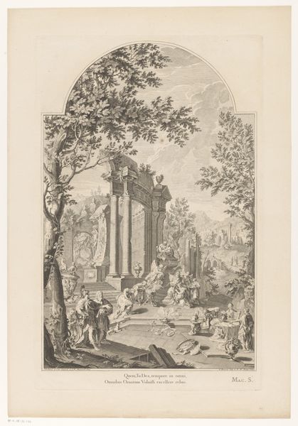 Curator: Ah, look at this engraving. It’s titled "Figuren rond een allegorisch grafmonument voor John Tillotson," created sometime between 1735 and 1741 by Nicolas de Beauvais. Editor: It's immediately striking how…precise the lines are. It gives off a solemn, almost theatrical air, with that arched framing and the way figures are posed around the monument. Almost staged, in a way. Curator: Precisely! Beauvais employed line engraving to craft this rather elaborate allegorical scene. See how he meticulously rendered the textures, from the drapery to the crumbling stonework? Engraving allowed for mass production of imagery—think of the labor involved in the printing. Editor: It's curious, though, isn't it? A baroque aesthetic rendered through what feels like almost industrial means. Look at those tiny figures gathered—who are they meant to be? Mourners? The scale difference between them and the monument itself feels deliberately… alienating. Curator: I suspect these figures represent various virtues or perhaps aspects of Tillotson’s character or legacy, being commemorated in this highly symbolic scene. The setting, part classical ruins and landscape, gives a historical and idealized depth, typical of Baroque memorial art. Editor: Baroque likes drama, yes. I’m fascinated by the choice of engraving, a readily available and replicable art form, to depict something so fundamentally linked to mortality. Does its being reproduced change our sense of the individual who is commemorated? The material betrays its time. Curator: That's an excellent point! There is something powerful about an art form often associated with wider circulation—reaching out to immortalize someone. This piece sits in the complex intersection between personal grief and collective memory-making. Editor: A lovely and sorrowful meeting. I'll admit, my initial reservations have waned. Looking closer reveals the nuances that challenge conventional readings of grief in that period. Curator: It’s so rewarding when technique, theme and intent seem to converge like this to unlock meaning, isn’t it?