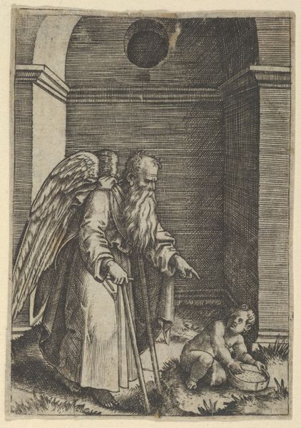 This drawing was made by Abraham van Diepenbeeck, likely in the 17th century, using brown ink and wash on paper. The fairly rapid and loose handling of the materials gives this work a sense of immediacy. But we might also consider the humbler aspects of its making. The artist has used common materials available in any studio. We see the fluid, almost casual application of the ink, giving shape to the bishop's robes, the angel’s wings, and the octagonal frame around them. Yet, the real subject here is not just religious, but also material: ordinary linen transformed into holy relics. The intimate act of caring for a baby, elevated to the realm of the divine. Through simple drawing techniques, Diepenbeeck reminds us of the labor involved in making art, and in making meaning. He invites us to look closely, past the ostensible subject, to the foundational act of caring for a new life. This piece underscores the connections between the earthly and the divine, the everyday and the eternal.