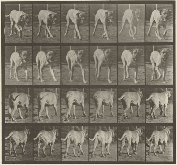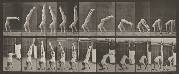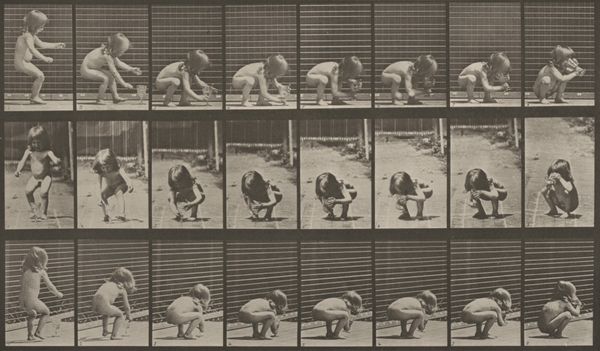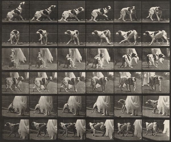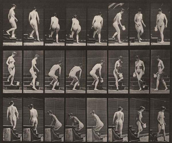 This is “Plate Number 182. Crawling on hands and knees,” made by Eadweard Muybridge sometime in the late 19th century, using photographic processes. At first glance, this series of photographs may seem purely scientific. But consider the labor involved. Each image required the subject to strike a pose, and for Muybridge to meticulously capture and develop each photograph. Taken together, they offer a groundbreaking study of human movement. The materiality of photography itself is crucial here. Each gelatin silver print, carefully arranged on a large sheet, freezes a moment in time, yet invites us to perceive movement. The stark contrast and crisp details emphasize the human form, while the grid format underscores the clinical, almost industrial, nature of Muybridge's project. Ultimately, this work challenges our assumptions about art, science, and labor. Is it a study of human locomotion, or a commentary on the human body reduced to a series of data points? Perhaps it's both, reminding us that even the most scientific endeavors are shaped by human hands and social contexts.