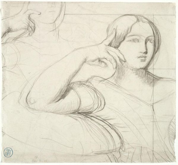 Curator: Immediately striking, isn't it? A dual composition, spare, and full of light. Editor: Indeed. Let’s look at "Profil de femme à droite et schéma de paysage," a pencil drawing by Narcisse-Virgilio Diaz. It pairs a delicate profile with what seems to be the barest suggestion of a landscape. It gives the impression of quick study or note. What stands out to you? Curator: The contrast is so direct – on the left, the face, a stark representation, almost mournful; on the right, an echo of nature, indistinct and floating. The pairing forces a consideration of the artist's state of mind and perhaps larger dialogues concerning the role of women, social identity and their placement within often romanticized visions of nature. Editor: Interesting reading. I am struck more directly by Diaz's hand and the means through which they explored and consumed material. The pencil strokes forming the face, tight and controlled, and in the landscape loose, scattered. We see Diaz directly exploring form and place with a specific material that enabled portable practices in open air settings. Curator: Absolutely, materiality matters. It suggests freedom and spontaneity, sure. But look closer. Are both explorations entirely free, or do social constraints impose themselves subtly? For example, this woman is turned to the right which creates tension; perhaps reflecting social expectation to stay back or quiet. And does this constraint directly impact what materials the artist can engage with and how? Editor: That is quite an interpretative turn! Still, the use of pencil allows a directness and efficiency and we could reasonably surmise that it enabled them to practice art outside of their established painting practice in this moment, no? This reminds me, this pencil is such an ordinary item and is not frequently discussed within art. And its relative worth impacts the worth we, the spectators, now bestow upon this drawing? Curator: Perhaps. Ultimately, both forms—portrait and landscape—serve as cultural mirrors reflecting social inequalities within both representation and the tools that create them, whether consciously or unconsciously on the artist's part. The piece serves as an investigation into a relationship between people and place. Editor: Well, for me, Diaz presents us with material possibilities and shows that the simple union of material and the land produce equally resonant images, together on the page. Curator: Thank you for emphasizing Diaz's practice of making. It makes the experience for both art appreciators and makers accessible and profound.