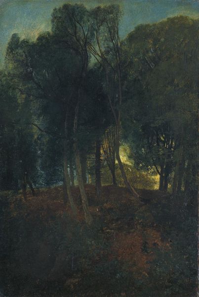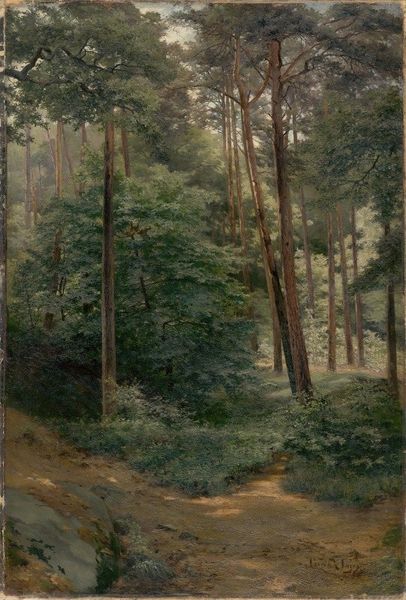 Curator: Here we have a piece by Camille Pissarro, titled "Allée Dans Une Fôret," or "Path in the Forest," rendered in oil paint. Pissarro, as we know, played a pivotal role in shaping the Impressionist movement. Editor: The mood is instantly captivating. There's this profound sense of depth created by the receding pathway, beckoning the viewer deeper into the woods. I feel almost pulled into a forgotten fairytale. Curator: The painting’s interest lies not only in the composition but also in the subtle nod it gives to the changing French landscape and the developing Romantic interest in the forest and notions of freedom, far removed from city structures. The play of light is, of course, a demonstration of impressionistic technique. Editor: And light here almost holds spiritual significance. Look at the trees as sentinels flanking this path – archetypes of the wild wood from so many cultural mythologies. The light piercing through them suggests secrets, hidden wisdom... what do you make of the figure depicted very faintly in the path's center? Curator: Good question. While the landscape in and of itself offered liberation, there still existed an everyday society in its perimeters; including this figure within his artwork perhaps allowed Pissarro to maintain familiar narratives from his time. Editor: I love the juxtaposition, placing this almost mythic woodscape with a mundane symbol. Curator: The use of such familiar symbols provides for the continued popular understanding of paintings such as this one. Its ability to resonate with new audiences solidifies Pissarro's status. Editor: For me, this path serves as a metaphorical dive into our collective unconscious. A painting from a different century inspiring timeless interpretations: how compelling.