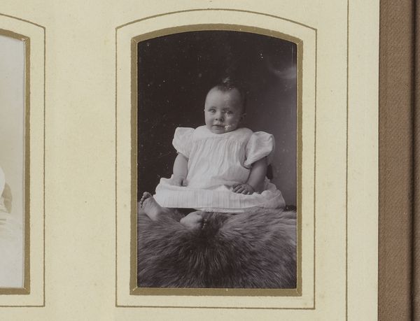 This is a photograph of a seated baby holding a flower, captured by Machiel Hendricus Laddé. Laddé, who lived from 1866 to 1932, worked during a time of significant social change. Reflect on what it meant to capture a child's image then. The baby, dressed in a frilly white dress, sits atop what appears to be a fur rug, gazing directly at the camera. The flower, a delicate detail, softens the formality of the portrait. Consider how gender and class are subtly presented here. The choice of clothing and the studio setting hint at a middle-class upbringing, while the baby's androgynous appearance invites questions about early gender socialization. The photograph exists as both a personal memento and a cultural artifact, reflecting societal values around childhood and representation. It invites us to reflect on the gaze, innocence, and constructed identities.