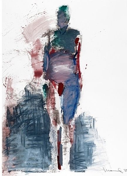 Editor: This is Patrick Procktor’s "Peter, Anguillara," a watercolor drawing from 1967. The washes of grey and single splash of blue feel really modern. What strikes you most about the piece? Curator: I'm immediately drawn to the stark contrast in technique. The figure is rendered with loose, almost gestural strokes, yet there's a surprising precision in the depiction of the blue shorts. Do you perceive how that tension impacts your reading of the image? Editor: It kind of isolates the shorts. I initially saw the pose as relaxed, maybe even vulnerable. But the hyper-detailed rendering of the shorts almost objectifies that area of the body, shifting the tone a little bit? Curator: Precisely. Consider the composition further: the cropping of the figure. What effect does that truncated form have? The face seems incomplete, almost abstract. Editor: That gives it a real immediacy, doesn’t it? The watercolor isn't trying to hide that it’s a study; Procktor focuses on form rather than realistic representation, which makes the blue all the more intriguing as a block of color. Curator: The color is applied almost independently of the structure of the legs. Does the stark contrast between form and formlessness play into that idea of isolation? Editor: Yeah, like the color becomes almost sculptural. I didn't notice that at first. Thanks for helping me look closer. Curator: Indeed. By focusing intently on the construction and chromatic relationships within the artwork, we arrive at insights that exceed surface appearances.