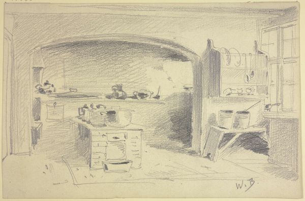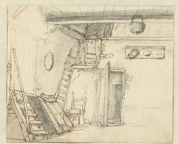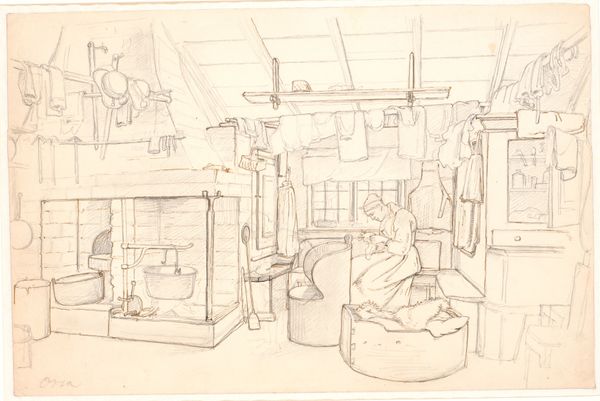 Curator: This pencil drawing by Wilhelm Busch, made sometime between 1855 and 1857, depicts an interior scene—'Stube mit Spinnrad und kleinem Hund.' Editor: It’s all rather dreamlike, isn't it? The wispy lines and the diffused light lend the scene a sense of quiet introspection, like a half-remembered memory. Curator: The domestic interior, as a theme, experienced considerable interest at the time, but you can still feel Busch's individual flair. It’s not just a drawing, but an emotion, don’t you agree? Editor: Absolutely. Look at the placement of objects. The spinning wheel, of course, evokes time, patience, and the weaving of fate, connecting to ancient mythologies and the eternal feminine. The little dog feels utterly real. Curator: I suppose he helps anchor the whole piece in reality, preventing it from spiralling too far into abstraction. Editor: Possibly, but the dog could also be interpreted as a symbol of fidelity, domesticity, even a hint of watchfulness against unseen threats. Think Cerberus, guardian of the underworld! Although, admittedly, this chap is less intimidating and more 'mildly curious.' Curator: (laughs) Indeed! Then we have all these stacked forms which seem a bit wobbly somehow... is it just me? I sense here also that feeling, almost ubiquitous in art, that even the most solid-looking things can soon topple down if we're not careful. Editor: The impermanence of material existence, rendered so delicately... I think Busch, with just a few lines, hints at deeper currents running beneath the surface of the everyday. Curator: Well, next time I want to illustrate the impermanence of everything, I will remember Busch. Editor: Next time, maybe, you'll pick up a pencil and surprise us all. I, for one, certainly learned a few tricks to suggest symbolism, and maybe even conjure a small familiar spirit—a house elf in the making, perchance.