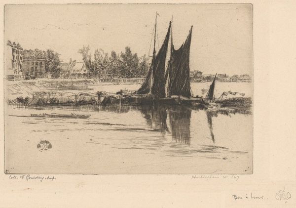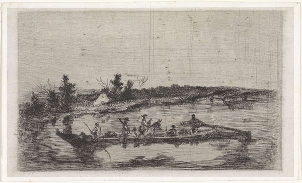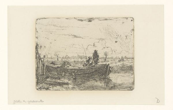 Arnoud Schaepkens created this small etching, "Landschap met bootje op het water", sometime in the 19th century. The composition divides the pictorial space into three horizontal registers: the sky, the landscape and water, and the lower bank. The artist uses dense clusters of etched lines to define the foliage on the upper shore, contrasting with the sparser, more horizontal lines used to depict the water. Note how the reflections of the boat and figures create a mirroring effect, almost bisecting the composition vertically. This division plays with the viewer's perception, blurring the line between reality and reflection. The scale is intimate, inviting close inspection, which compels us to consider the balance between detail and abstraction in Schaepkens' technique. The etching, with its intricate yet economical use of line, captures a moment of serene contemplation, reflecting the artist's engagement with both the observed world and the formal qualities of the printmaking medium.