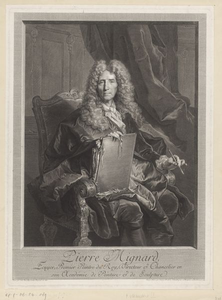 Curator: This is Georg Friedrich Schmidt's portrait of Pierre Mignard. It's striking how Mignard is presented: perched at the intersection of artistic mastery and royal authority. What do you see in this representation of power? Editor: It feels very staged, almost performative, with the flowing wig and the poised hand holding the pen. Is this performativity itself a form of power? Curator: Exactly. Schmidt isn't just depicting Mignard; he's constructing an image of artistic genius intertwined with societal status. Think about the French court, the systems of patronage, and how identity was crafted through representation. Editor: So the portrait is not just about Mignard, but the social and political structures that gave him power? I hadn't considered that. Curator: Precisely. It makes you wonder about who gets to be remembered, and how. Editor: This definitely makes me rethink portraiture's role beyond mere representation. Thanks!
