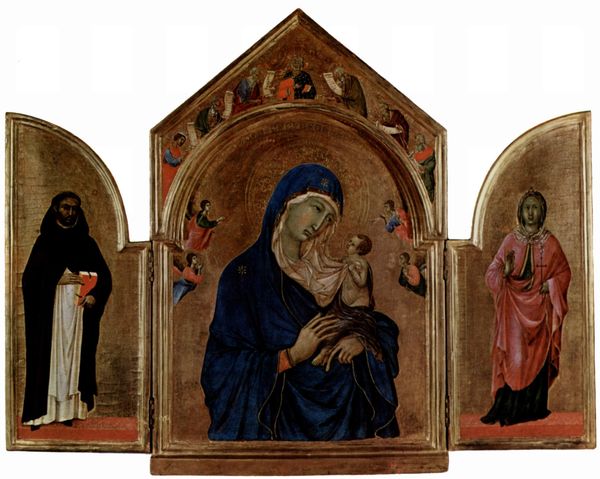 Editor: We’re looking at “Madonna and Child with the Blessing Christ, and Saints Mary Magdalene and Catherine of Alexandria with Angels,” a tempera and oil on panel triptych by Pietro Lorenzetti, around 1340. It’s really striking how the gold background and the figures' solemn expressions create this otherworldly, reverential mood. What can you tell me about this piece? Curator: This triptych offers a window into the devotional practices and societal values of 14th-century Italy. The commission of such a piece speaks to the patron’s wealth and piety, and their desire to project a certain image. Notice the rigid poses and symbolic objects. How do these choices communicate power, status and cultural importance? Editor: It’s like each panel is a carefully constructed stage. Curator: Exactly. Consider also the role of the Church. It was not only a religious institution, but a major political and cultural force. Works like this served to reinforce religious doctrine and social order. The choice of saints—Mary Magdalene, associated with repentance, and Catherine of Alexandria, a symbol of wisdom and learning—further emphasizes the virtues valued by society and promoted by the Church. How do you see the choice of these specific figures relating to the artwork's intended audience? Editor: It’s interesting to think about who would have been looking at this originally. Probably wealthy donors. Curator: Precisely! This image probably wasn't for mass consumption; its political role resided in demonstrating affluence and reinforcing specific ideas within a privileged social circle. It makes you question, doesn't it, how art serves various socio-political purposes across different contexts? Editor: Definitely. I initially just saw a pretty picture, but now I understand how much more there is beneath the surface about social structures and wealth. Thanks for pointing out the deeper story of it! Curator: My pleasure. It’s a good reminder that art always exists in dialogue with its time.
