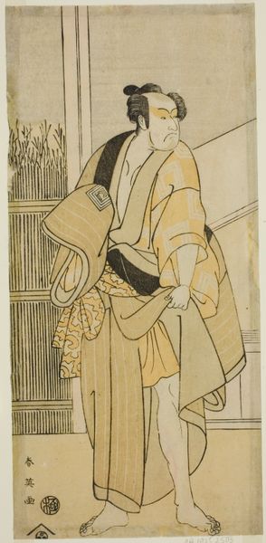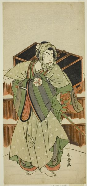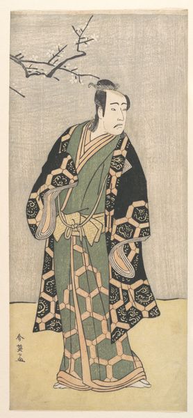 Editor: Here we have Katsukawa Shunko's woodblock print from 1786, titled "The First Nakamura Nakazo in the Role of Ko no Moronao". It’s a striking portrait; I'm drawn to the color palette – the muted greens and yellows create an interesting tension. What are your thoughts on the composition? Curator: Indeed. Immediately, one observes the artist's masterful manipulation of line. Consider how each stroke contributes to the overall visual structure. The sharp, angular lines that define the figure’s robes juxtapose beautifully against the softer, curved lines of his face. Notice the flatness, characteristic of ukiyo-e prints, achieved through the layering of colors. What effect does this flatness achieve, do you think? Editor: I suppose it emphasizes the patterns and the textures of the clothing and the background. It seems less about creating realistic depth and more about the interplay of shapes and forms on the surface. Curator: Precisely. It directs our focus toward the abstract elements: the geometric pattern in the background versus the organic motifs on the kimono, the actor’s controlled pose, and the mask-like application of makeup. The overall composition serves not to represent reality but to construct an artifice, drawing attention to the artificiality inherent in both theatre and printmaking. The figure's imposing stance reinforces a sense of controlled tension and dramatic presence. Note the contrast in textures between the background geometric motif and the floral design of the kimono. What’s its significance? Editor: I'd venture to guess it adds another layer of visual complexity. Almost a dialogue between the artificial and natural, reflected both within the depicted character and the construction of the image itself? Curator: Precisely. An astute observation, illustrating that beyond mere representation, the print explores the potential of form itself as the conveyer of meaning. Editor: I appreciate how the artist utilized shape, form, and even flatness to construct a dynamic image. Thank you. Curator: My pleasure. It highlights the layered experience of art-making that allows both construction and meaning.