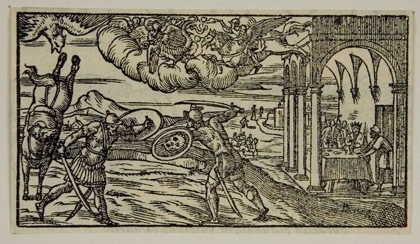 Curator: This little print, called "Canto 7, p. 56," is from an unknown artist, residing here at Harvard Art Museums. It gives me chills, like a half-remembered dream. Editor: It’s a strange scene. The energy of the horses charging feels at odds with the figures relaxing in the background. Curator: I think it's about contrasts, wouldn't you say? The city versus the open field, rest and action… Perhaps even the known versus the unknown, given the artist's anonymity. Editor: That unknown element is certainly key. It frees us to project our own narratives onto it, to fill in the missing story. It's a compelling tension. Curator: Exactly! And isn't that the beauty of art, at its core? The dialogue it sparks within us. Editor: Yes, and it also reminds us that art is not just about individual genius, but also about the social conditions that allow artistic production. Curator: True, it all intertwines, doesn't it? The personal and the political, the seen and the unseen. Editor: Precisely, making this little image, so simple, so dense.
