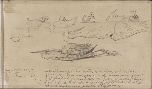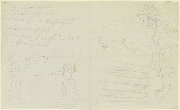 Curator: Here we have Rosa Bonheur's "Illustrated Letter to M. Roland," created sometime between 1840 and 1899. It's a charming example of her lesser-known work, composed of ink on paper and currently residing at the Metropolitan Museum of Art. Editor: My first impression is that it's delightfully chaotic. The energy practically leaps off the page! It's small in scale, but manages to pack a humorous punch. What story is unfolding here? Curator: Indeed, it offers a window into Bonheur's world, her relationships. On one side, there’s a handwritten letter, and opposite, a series of lively sketches illustrating—humorously, I imagine—the woes of artistic creation. It reveals the daily struggles an artist must have, always exposed to the hazards of exterior settings. Editor: It’s tempting to interpret those scenes as allegorical. Is this Bonheur’s symbolic portrayal of the artistic struggle, battling the elements, both literal and metaphorical? Or is it literally just a sketch that illustrates challenges when working outside, that may disrupt concentration and peace while one engages the environment with an open mind and eyes? Curator: Perhaps both! Bonheur certainly infused her animal paintings with symbolic weight, so it wouldn’t be out of character. She may want to offer an archetypal representation of art in the context of a broader world, as reflected, for example, in Romanticist aesthetics and thinking. At the very least, it reveals a lighthearted side to Bonheur that contrasts with the gravitas of her more famous canvases. Editor: Absolutely. The composition reminds me of satirical prints popular at the time—like something out of Daumier’s studio. There is definitely a sense of caricature, a commentary of sorts of Bonheur herself! Even down to the self-deprecating humor with someone clearly suffering for their art. I see some cultural history present in those pen strokes. It gives this object more depth as a social document. Curator: Precisely. We see her engaging with, and perhaps poking fun at, the Romantic ideal of the suffering artist, struggling heroically against the odds. A brilliant illustration, to that effect. The images here serve a didactic purpose that goes far beyond what’s on the surface, perhaps all the way to the author. Editor: Ultimately, this illustrated letter transcends a simple personal note; it stands as a commentary on the artistic condition and the artist's resilience, rendered with humor and grace, in what can only be an inspiring account to contemporary viewers and creators. Curator: Agreed. It's a gem that humanizes Bonheur, reminding us that even great artists face daily absurdities. A precious visual record of both Bonheur and art’s intrinsic relationship to broader human endeavours, I’d argue.