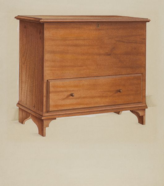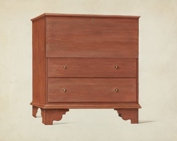 Editor: We’re looking at a drawing of a "Shaker Cabinet," made around 1936. The artwork uses wood as a primary material. What immediately strikes me is its almost mathematical arrangement, the grid formed by the drawers and doors. How would you interpret this piece? Curator: Precisely. The visual language speaks volumes. Focus first on the cabinet’s form. Note the rectilinear shapes, the repetition of the drawers, and the balanced symmetry. It subscribes to an almost Platonic ideal. This object presents a study of pure form and function; it doesn’t need to rely on color to achieve impact. What purpose do you think that visual decision achieves? Editor: Perhaps it highlights the texture and natural variations within the wood itself, allowing the craftsmanship to come forward? The artist Anne Ger wants us to contemplate on form? Curator: Yes, exactly. The very specific aesthetic choices that an artist makes. A minimalist visual effect can, paradoxically, demand even closer attention to line and plane. What philosophical traditions does this arrangement recall for you? Editor: The emphasis on functionality reminds me of the Bauhaus movement—an exploration of rational forms that strip away ornamentation. Curator: Precisely. Think about how that concept interacts with philosophical approaches such as existentialism or transcendentalism. Can you sense a narrative around being? Editor: I see what you mean; there's a stillness and deliberate lack of distraction that asks viewers to engage with the object and maybe even with themselves. Thanks for this discussion. Curator: My pleasure. Studying the intentionality and the considered structure will help in analysing visual texts, every time.