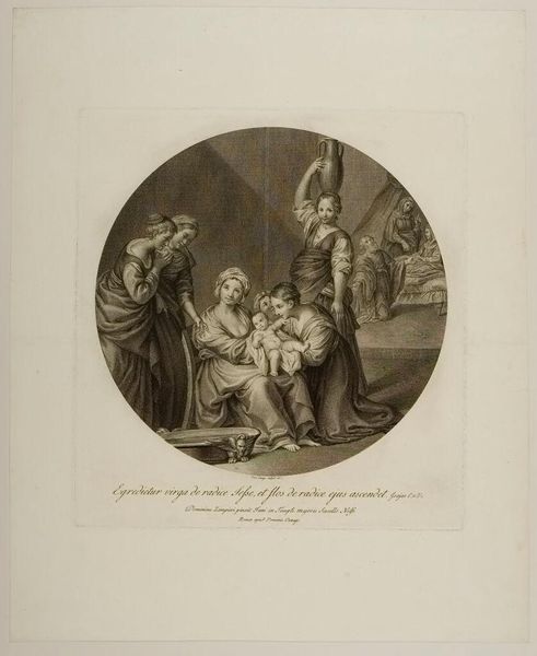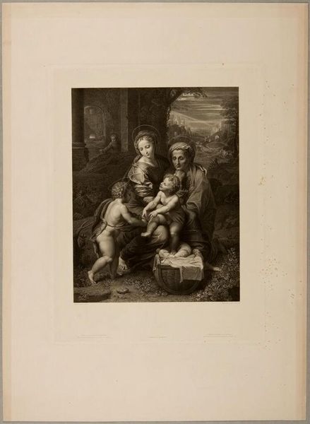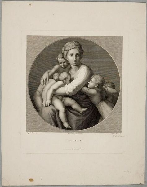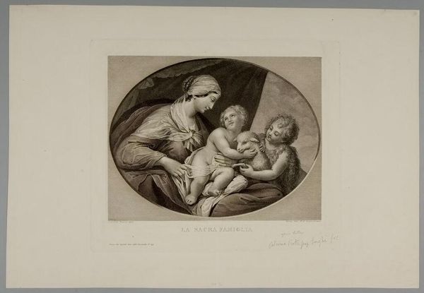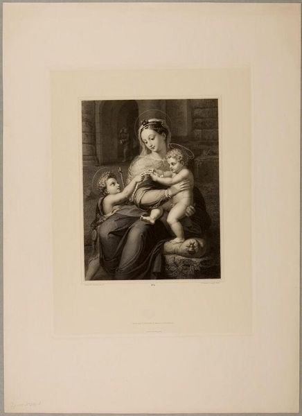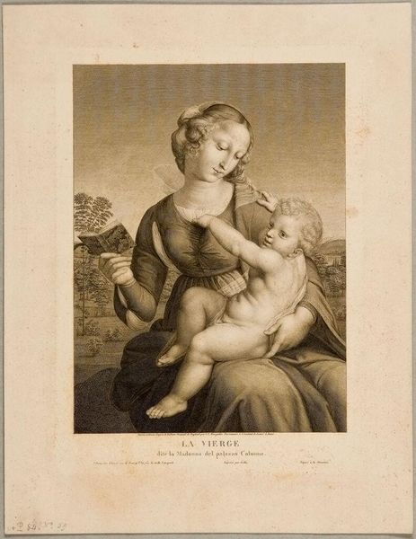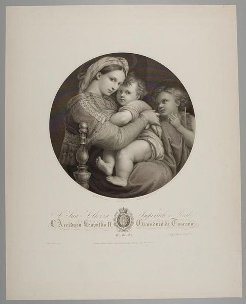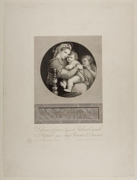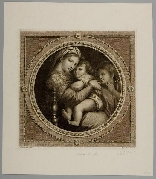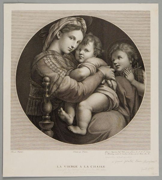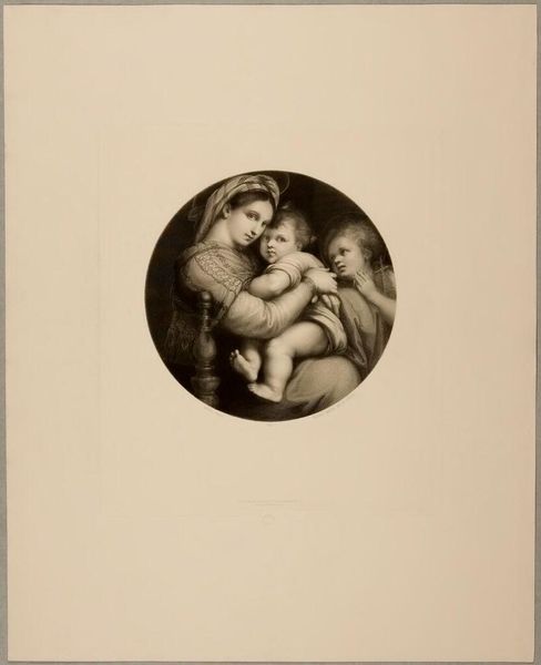 Editor: This is Johann Heinrich Ludwig Petersen's "La Madonna della sedia." It's arresting how Raphael's original painting is translated through printmaking, shifting its availability and meaning. What strikes you about the work's material transformation? Curator: The print medium significantly democratizes access to religious iconography. Consider the labor involved. Printmaking facilitated a new form of artistic production, moving images from elite spaces to broader consumption. Editor: So, the material process changes the way people interact with religious imagery? Curator: Precisely. This reproductive method detaches the image from its unique origin and allows for mass distribution, thus altering its social value. It becomes a commodity, a piece of the market. Editor: That’s a fascinating perspective. I hadn’t thought about it in terms of production and consumption. Curator: The focus on materiality reveals the artwork's connection to broader social and economic systems of its time.