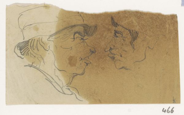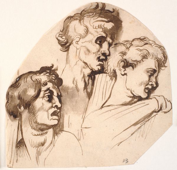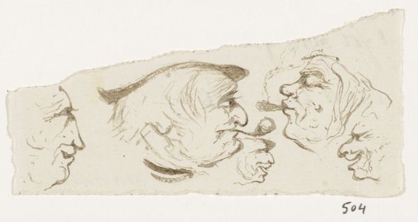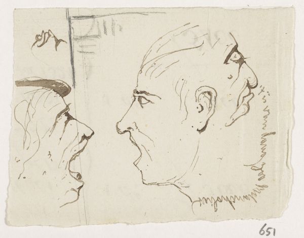 Editor: So, this pen and ink drawing is titled "Rijtje koppen," or "Row of Heads," by Johannes Tavenraat, made sometime between 1840 and 1880. I’m struck by the economy of the lines. It's almost like a quick study, capturing different characters, all in profile. What stands out to you about these faces? Curator: The immediate effect is, indeed, character. Each profile becomes a landscape of cultural memory. Look at the stark simplicity of the first, compared to the heavy lines around the jowly face in the middle. Don't you feel an implied story, almost a class distinction being suggested? Editor: Yes, definitely. It’s almost like a social commentary hidden in these swift sketches. But, it’s difficult to know if we are simply projecting meaning onto these figures. Curator: Perhaps. But line, itself, is a symbol. Think of the sharp, unwavering lines used for the first profile, embodying youth and perhaps aspiration, versus the broken, almost hesitant lines of the aged face, weighted down by experience. How does that visual contrast affect your interpretation? Editor: That’s a fascinating way to look at it! It makes me think about how even simple sketches can carry so much cultural weight and communicate ideas beyond just visual representation. Curator: Precisely. And this interplay between line and character allows Tavenraat to explore deeper societal truths. We are not simply seeing heads, but we glimpse, for instance, entire cultural narratives etched onto the page. Editor: This really does add layers of meaning. Now I'm wondering about the implications of the repeated profile view. I initially saw it as just a compositional choice, but I wonder if that too has symbolic importance? Curator: That is something to contemplate! A new dialogue begins.