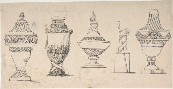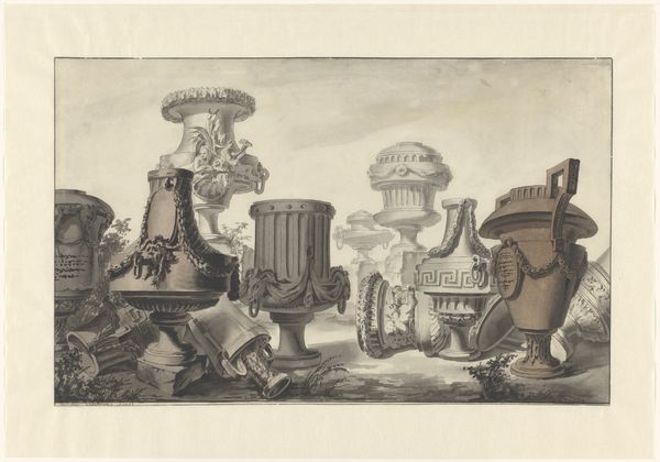 Editor: Here we have Jean Jacques Lagrenée’s 1765 etching, “Fragments of Antiquity,” currently residing at the Metropolitan Museum of Art. I’m really struck by how cluttered it is, but not in a bad way, like an attic full of interesting artifacts. How do you interpret this kind of collection of ancient objects? Curator: It feels like a memory palace, doesn’t it? As if Lagrenée wasn't just documenting these objects, but conjuring them from some forgotten corner of his imagination. He arranges these "fragments" like actors on a stage, hinting at grander narratives, perhaps a lost play or a whispered legend. And the very deliberate use of line, the meticulous detail...it's like he's inviting us to piece together the puzzle of antiquity ourselves. Do you find that the medium contributes to that sense of historical distance? Editor: Absolutely! The etching makes it feel almost archaeological, like we're seeing an imprint or a ghostly echo of the past. All of the elements point towards a recreation or preservation, what do you make of the use of objects like the vessels depicted here? Curator: Yes, precisely! Consider the vases, for example. Each one bears witness to lives lived, stories told, secrets kept. Their fragmented state only deepens the mystery. These are more than mere objects, they’re containers of memory, holding echoes of laughter and loss, of empires risen and fallen. And notice how Lagrenée imbues them with a sense of melancholy grace. Editor: It really does invite contemplation. Seeing the remnants, it makes you wonder about everything that’s been lost, but also appreciate what's survived. Curator: A delightful tension between loss and rediscovery, don't you think? Perhaps the point isn't to reconstruct the past perfectly, but to find ourselves in the fragments that remain.