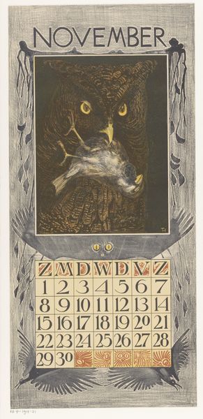 Curator: Looking at the 'Kalenderblad juli met apen' by Theo van Hoytema from 1905, what are your initial thoughts? It's currently held here at the Rijksmuseum. The work is a print featuring watercolor illustration in that distinct Art Nouveau style of the era. Editor: It feels...melancholy? Those monkeys have a human-like stillness, especially the one staring directly ahead. It's more than just illustration; there’s an unexpected depth there. It's interesting that the calendar grid feels secondary to this primate scene. Curator: Hoytema was quite the social critic. He produced these calendar sheets annually, often using animal imagery to critique societal norms. The choice of monkeys could represent the imitative, sometimes mindless aspects of human behavior he observed. Art Nouveau and Symbolism intertwine here. Editor: So, the monkeys aren't just being cute. They’re stand-ins, little reflections staring back at us. I wonder about his process. The texture gives it such an immediate feel; almost as though the monkeys emerged organically from the watercolor itself. And the muted greens… almost oppressive? Curator: Consider the institutional role of the calendar too. It’s a functional object, placed within the home. By using animal figures to critique bourgeois society, Hoytema inserted social commentary into everyday life, challenging conventions and sparking thought outside of a museum setting. Editor: Absolutely! A silent rebellion displayed month by month, almost like a visual manifesto quietly ticking on the wall. It challenges how people consider the natural world, morality and societal progress through subtle irony. Curator: Indeed, his artistic strategy gave this printed calendar power. It moved art into a conversational space, blurring boundaries. Editor: Well, this monkey business has given me a lot to ponder! Thanks for shedding light on Theo's layered narrative within something as simple as a calendar sheet. Curator: It's rewarding to bring new insights to pieces such as this, even after all these years. These calendar sheets demonstrate art's ability to penetrate beyond galleries, shaping viewpoints subtly, yet profoundly.