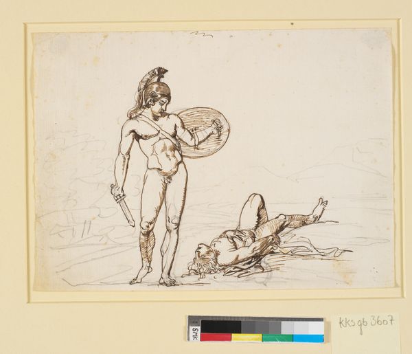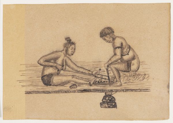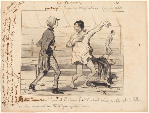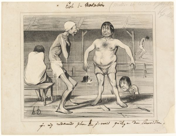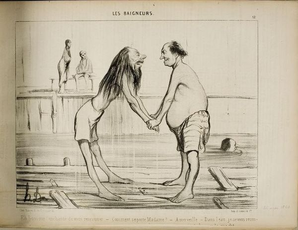 Honoré Daumier created this lithograph entitled "Eh bonjour! enchanté de vous rencontrer..." using black crayon and pen. The composition focuses on the stark contrast between two central figures in a bathhouse setting. The use of line is particularly striking, with a dense network of fine lines creating textures and volumes that define the men's bodies. Daumier’s strategic use of distortion and exaggeration, such as the attenuated limbs of one figure and the corpulent physique of the other, serves to challenge conventional ideals of beauty. The starkness of the scene is heightened by the contrast between light and shadow, achieved through varying densities of lines. This contrast accentuates the grotesque yet poignant qualities of the figures. The lithograph transcends mere caricature, functioning as a critique of social types. The bathhouse setting serves as a stage for the performance of societal roles, where the body becomes a site of both vulnerability and display. Daumier invites us to consider how representation shapes and distorts our perceptions.