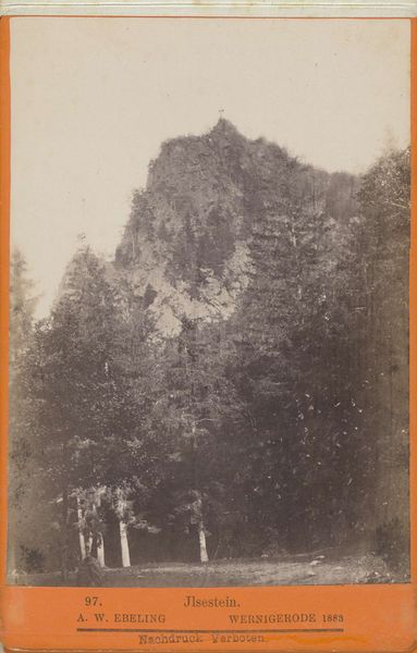 Curator: Welcome. Before us is a gelatin silver print, a photograph titled "Kloof met rotsformatie in de Verenigde Staten," which translates to "Canyon with Rock Formation in the United States." We believe it was taken sometime between 1880 and 1900 by George Fiske. Editor: My immediate sense is of verticality and almost cathedral-like grandeur. The soaring rock formations dominate the background, framed by these impressively aged trees. It’s a space that seems both imposing and strangely peaceful. Curator: Yes, that spiritual dimension resonates. The sharply rising rocks definitely call to mind spires or natural monuments. I can see how a Hudson River School painter might appreciate a motif like that, don't you think? Those formations almost represent nature striving toward the divine. Editor: It is fascinating that you mention this detail. Because if you look at it through a compositional lens, Fiske has meticulously structured the photograph to draw your gaze upwards. The strong vertical lines of the trees in the foreground lead the eye to those peaks. The effect suggests sublime elevation. Curator: The image seems intended to tap into deep seated associations as a powerful presence. The native American peoples of that area no doubt had specific stories connected with geological landmarks. Fiske's framing acknowledges, almost unintentionally, the ancestral weight these spaces would carry. Editor: I see that. The light and shadow too. The photographer masterfully uses contrasts to reveal depth and texture in the canyon, from the illuminated rocky surfaces to the shady, mysterious depths of the forest, creating a structured view for our gaze. The different vegetation stages seem to be creating an access to the natural world, just by seeing it. Curator: This is the essence of its power, that blending of tangible landscape and transcendent aura. I found your perspective revealing to confirm how symbolism speaks in unexpected tones when carefully captured. Editor: And, in turn, your thoughts shed light on the broader artistic and cultural context of this photograph. I am amazed by the richness of interpretation we find in the intersection of form and symbolism, aren't you?