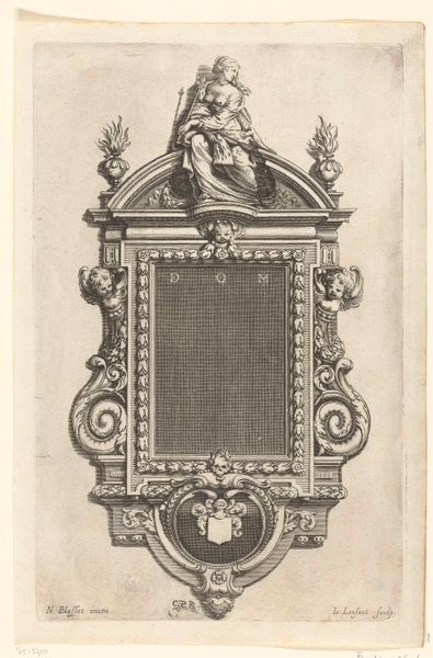Curator: This engraving, "Grafmonument met portret van Georg Jacob Schrazenstaller," was created in 1795 by Christoph Friedrich Theodosius von Schad. It's a fascinating example of neoclassicism. What strikes you about it? Editor: Immediately, I’m drawn to the layered composition. The starkness of the black and white lines emphasizes the materiality of the engraving process. There's a formality here but something a bit unsettling in the arrangement. Curator: Yes, that unsettling feeling, I believe, stems from the commemorative purpose, typical for its period. It represents Georg Jacob Schrazenstaller’s memorial. We need to unpack who he was and his impact on Viennese society to understand this artwork better. Editor: Absolutely. The image of the engraver within the tomb suggests the literal process of labor, doesn't it? How his image is imprinted as labor within his memorial, thus linking work, commemoration, and production quite explicitly. The choice of engraving for a sculptor's memorial is clever and emphasizes labor as part of one's life and achievements. Curator: And the allegorical figures and architectural framework reinforce that connection to neoclassical ideals. However, it’s also vital to consider how class structures impacted not just who was commemorated, but how the means of his remembrance would have been consumed. Who did Schad intend to view it, and how? Editor: It becomes clear we should consider production for its own sake and the class system it created. I notice also how the engraver utilized dense crosshatching in darker areas while using simple lines elsewhere, really highlighting material effects while demonstrating skills associated with different tiers of artisanal production. Curator: Analyzing it in terms of the artistic skills displayed gives us a broader framework to interpret art's purpose back then. To move towards deeper, more intersectional views about how neoclassicism intersects gendered norms or issues relevant to contemporary art discourses, we should ask those questions. Editor: Seeing the artist’s choice of materials combined with social issues gives the engraving a contemporary edge. In studying these means we bring his art to broader, contemporary debates and relevance. Curator: Precisely. Only then can we really say how far artwork's narrative moves out of mere historical account into enduring themes we deal with today. Editor: I agree completely, it transforms a study of processes into a study of values.
