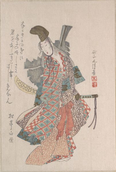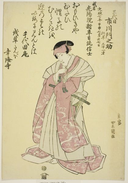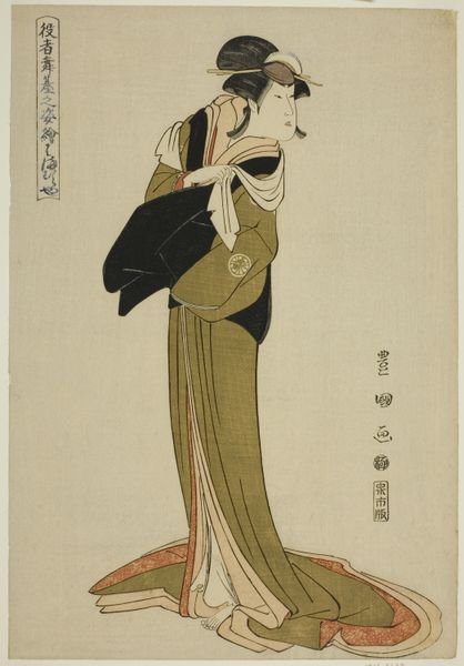 Curator: Let's take a look at Utagawa Toyokuni I's woodblock print from 1794, now at the Art Institute of Chicago, titled "Yamatoya: Iwai Hanshiro IV as Katanaya Ohana, from the series 'Portraits of Actors on Stage.'" What strikes you first? Editor: The constrained, almost mournful, color palette. The predominantly mauve robe feels so heavy, weighing down the figure and emphasizing the stark asymmetry of the composition. Curator: Toyokuni I, working within the Ukiyo-e tradition, was deeply embedded in the floating world of Kabuki theater. These actor prints were hugely popular commodities. Think of them as early forms of celebrity endorsements. Editor: Right, so this wasn't simply artistic expression; it was a commercially driven project showcasing Iwai Hanshiro IV. The emphasis on detailed costume—note the geometric patterns and crest—certainly points to that performative, manufactured image. And even the way the garment seems to drape and flow—it’s almost sculptural in its visual weight, drawing the eye to the intricacies of form and color relations rather than human connection. Curator: Precisely. These prints democratized access to Kabuki stars for those who couldn't afford theatre tickets, acting almost as a kind of merchandise. And it wasn't only about surface appearance. Toyokuni was working at a fascinating moment where artisan workshops produced these prints. Different crafts persons were responsible for carving the woodblocks for each colour and the print production line was quite intensive. Editor: You can clearly see that layering in the prints' coloration. But despite the complex craftsmanship, for me, the actor's contorted pose steals the show. Notice how the hands awkwardly clutch his clothing. What statement is that intended to produce? Curator: It's a moment of both stylized theatricality and perhaps, vulnerability. Kabuki roles often demanded actors to embody exaggerated emotions and characters, in this instance the rendering feels almost comedic. Editor: Agreed, there is caricature. Toyokuni gives us an exaggeration of a feeling being performed rather than sincerely felt. A reminder perhaps of how carefully constructed our realities are. Curator: And a fascinating look at the intersection of craft, celebrity, and social mobility in Edo-period Japan. Editor: Yes, the formal qualities work to express societal values. A beautiful merging.