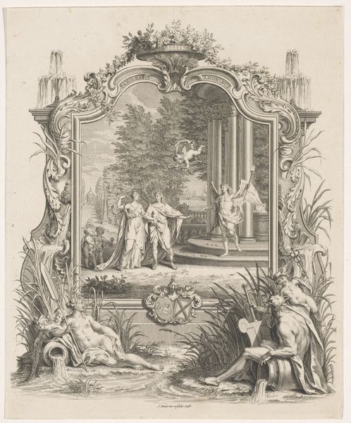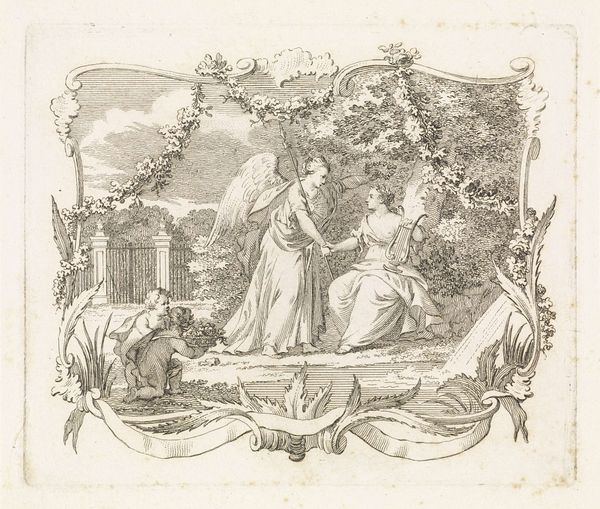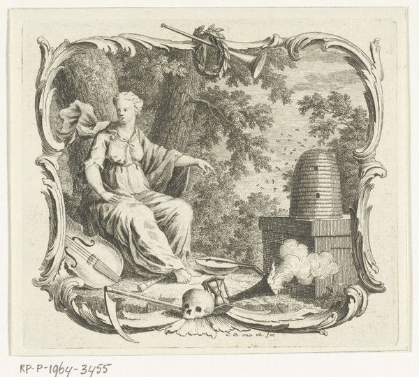 Editor: This is "Minerva as patron of education and the arts" by Simon Fokke, made sometime between 1722 and 1784. It's a print, a pen drawing really, full of such fine lines. The goddess Minerva sits in this ornate, oval frame... It feels like I'm peeking into a world of classical ideals. How do you interpret the imagery at play? Curator: Fokke presents Minerva, a potent figure. How does he mobilize symbols to transmit concepts of education and artistic ingenuity to viewers then, and even now? Let's explore the lasting emotional power of these symbolic components. Editor: The books and the beehive, of course, suggest knowledge and industriousness…and then there's the cherubic figure. Curator: Note how the books represent accumulated knowledge and learning, forming a literal foundation. Then, consider how the bees exemplify diligence and collaboration, mirroring the processes involved in art and scholarship. The cherub could point to inspiration, almost like a divine messenger that acts as an emblem of innocent curiosity, no? How would these emblems function together in the mind of an 18th-century viewer, do you suppose? Editor: That's interesting; so the cherub embodies a desire to learn, guiding people to knowledge? Curator: Exactly! This combination emphasizes Minerva's role not just as a guardian of established wisdom, but also as an advocate for the continuous pursuit and innovation of arts and knowledge. She almost guarantees a safe delivery of tradition to a new future. And the inclusion of that spear... does that skew your first, gentle impression any? Editor: It does! Almost makes the scene a little…combative? I mean, the pursuit of knowledge isn't always peaceful, I guess. Curator: Yes, knowledge is defended and applied. Together, these elements portray her influence over creativity and the expansion of intellect through constant engagement and dedication. Editor: That really does pull the whole picture together. It's so much more than just a pretty picture; it's a statement. Curator: A statement delivered through a common language of symbols, a shared cultural memory we can still decipher centuries later.