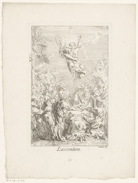 Curator: This delicate engraving is attributed to Arnold van Westerhout, dating back to 1687, and is titled "Allegory on the Resurrection of Christ(?)." What's your immediate reaction to this piece? Editor: I’m immediately struck by the subdued quality, a serene almost ethereal tone conveyed through delicate linework, which presents the piece’s potentially revolutionary subject in a particularly subdued, privileged tone. Curator: It is quite intricate, isn't it? Look closely at the technique. Van Westerhout employed a very fine line in creating this composition, using varied hatching and cross-hatching techniques to create shading and volume. Think about the labor involved in the act of creation here, the physical production required. This process allows the landscape setting to be given the same presence and detailed quality as the human figures in the scene. Editor: Absolutely, I'm curious to know what those precise choices are saying politically and religiously. This engraving presents not only an allegory of Christian resurrection, but potentially says more broadly about hope or personal rebirth and agency for oppressed people in a way that wouldn’t invite backlash from governing forces. What societal narratives are they tapping into? The banner reads "NEC DVA, NEC," possibly meaning "Neither two, nor...", adding layers to interpretations about wholeness, unity, or transformation. Curator: You make an excellent point about agency. Focusing on the materiality, note the physical object itself: paper, ink, metal plate. Who owned this print? Who could afford it? Was it widely distributed or a private commission? Considering these material factors contextualizes how narratives are formed and transmitted and to whom. Editor: And how that influences reception; because let's be honest, this work would definitely elicit vastly different responses across gender, class, and racial divides, given that its content, regardless of the artists’ intentions, centers white, gendered ideals and experiences. The cost, materials, and imagery of the work clearly align with very limited wealthy sectors of society. Curator: These layers really highlight how intricate the socio-economic history and artistic technique become. Examining that close relationship sheds some light on both our present and the past. Editor: Indeed, a work of this era provides critical points to assess prevailing ideas about art, power, and collective identity.