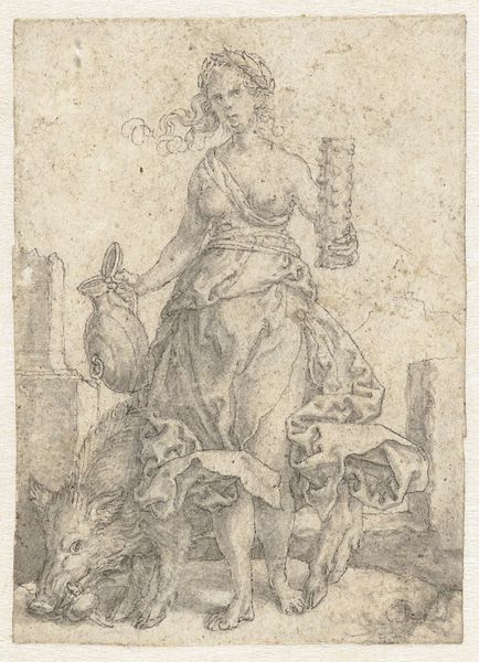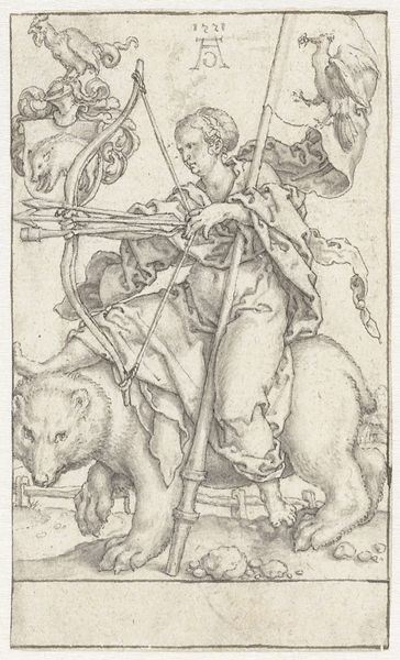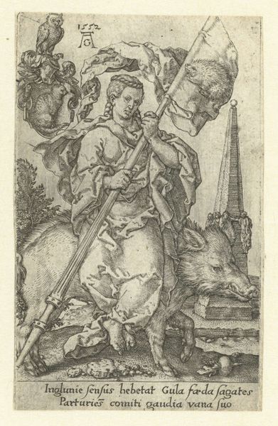 Editor: This engraving from 1551, by Heinrich Aldegrever, is called "Onmatigheid," which I understand translates to "Immoderation." The allegorical figure strikes me as almost serene, yet she's surrounded by all these symbols that suggest something much darker is going on. What do you see in this piece, in terms of symbolism and what it might represent to its original audience? Curator: This work speaks volumes through its iconography, doesn't it? Consider the boar – an ancient symbol of gluttony, particularly unrestrained appetite, bearing the woman. Note also the hedgehog on the banner – often associated with greed, and the owl above the coat of arms referencing nighttime recklessness. Editor: So, these animals aren't just decorative? They're meant to convey specific vices? Curator: Precisely. The Northern Renaissance, particularly, loved using such bestial symbolism. But consider beyond the animals. What about the figures hanging from the gibbet behind the boar? And the skull and bones? Editor: I guess they speak to the consequences of these unchecked desires, leading to ruin and death. It feels like a moral lesson conveyed through a visual language. Are you saying, Aldegrever wanted to depict how these actions lead to self-destruction, that they represent specific character flaws, but also societal warnings about immoderation? Curator: Exactly! It speaks to a deeply embedded fear within the culture, a concern about the individual's responsibility in maintaining social order. Each element is part of a web of cultural meaning that's both fascinating and cautionary. Editor: I hadn’t considered the depth of the interconnected symbols and warnings. I now see how Aldegrever layers meaning within seemingly simple imagery to engage viewers on many levels. Curator: Indeed. It's a vivid reminder that images always carry a cultural weight far beyond their surface appearance.