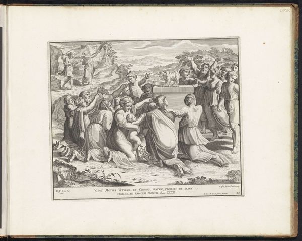 Cesare Fantetti produced this print, "Moses striking water from the rock" in the latter half of the 17th century. It demonstrates how biblical stories were disseminated through printed images. This print is an excellent example of the use of religious imagery to reinforce cultural values and social hierarchies. Made in the Netherlands, during the Dutch Golden Age, the image reflects a society deeply influenced by Calvinism. Note the importance of the Old Testament stories in Protestant theology. The image emphasizes the miraculous intervention of God in human affairs, reinforcing the idea of divine power and the importance of religious faith. The distribution of such images served to educate and reinforce religious values among the populace. Historical research into the production and reception of such prints can reveal much about the social and religious life of the time. This includes understanding the role of printmaking workshops, the market for religious imagery, and the ways in which these images were used in homes and churches.