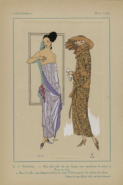 Curator: Ah, yes, "Gentils Propos," or "Sweet Nothings." George Barbier created this watercolour illustration in 1921, right at the height of the Art Nouveau movement. Editor: Immediately I get a feeling of sweetness... nostalgia. It's like stumbling upon a half-remembered fairytale. Those soft, pastel hues—it's incredibly gentle on the eyes, wouldn't you agree? Curator: It absolutely encapsulates the romantic longing of the era. Consider the figures themselves: clad in what appears to be stylized Czech or Slovak folk dress. This cultural romanticism became quite popular, particularly during periods of national self-discovery. Editor: I love the slight awkwardness of the scene. They're clearly flirting, but they're separated by that flimsy fence, which, let’s be honest, adds to the charm, rather than hinders it. Curator: The fence is quite symbolic, actually. It could represent a social barrier, perhaps one of class or familial expectation, that the couple must navigate. The cherry blossoms above suggest the blossoming of love, but their placement almost feels like a visual blessing, hallowed through their location near what is specified on the top right side of the image. Editor: Or maybe, it's a comment on barriers in general. He drapes that white cloak behind him in what appears to be an affectation; there's that mountain range beyond, giving you an opportunity to imagine something larger than themselves, or that they may not be thinking, or ready for at all. And all with a wink from those whimsical floral designs throughout their apparel. I wouldn’t expect love would be any easier than those other things! Curator: Indeed. Barbier's figures often inhabit a world of stylized grace and delicate melancholy, very true to that post-WWI sense of trying to discover what true love would even look like after so much war. But their outfits show how tradition persists through changing perspectives. It adds depth. Editor: It’s really evocative. It’s like looking at a beautifully crafted music box – fragile, lovely, a tiny little melody contained within its painted walls, but always there if we seek to view its moment anew. Curator: Absolutely. There's a cultural persistence expressed, showing us a glimpse of love through a particular aesthetic, inviting reflection on its historical relevance as well as enduring themes. Editor: Leaving us to hope perhaps these sweet nothings are but a prelude to something even grander between them!