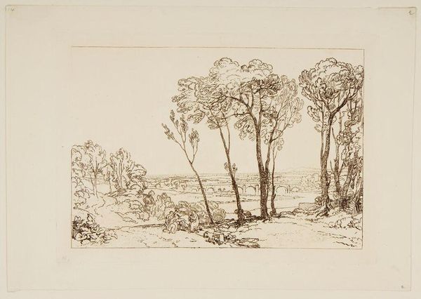 This etching titled "The Bridge in Middle Distance" was made by Joseph Mallord William Turner. Dominating the vista, the bridge serves as a potent symbol of connection and transition. Bridges have always held a prominent place in the human psyche. Think of the "Ponte Vecchio" in Florence, where the bridge is not just a crossing, but also a place of life, trade, and gathering. The bridge here is not merely functional; it invites us to contemplate the thresholds we cross in our lives—from the mundane to the momentous. Much like the Roman "Pontifex Maximus," who bridged the gap between the earthly and divine realms, Turner’s bridge beckons us to explore the spaces between worlds, both seen and unseen. The bridge motif is one we see repeated throughout history. Yet here, it is softened by the picturesque surroundings and a group of figures sitting in the foreground, inviting contemplation. The composition might touch us deeply, stirring ancestral memories of journeys and passages. Ultimately, this image captures a moment where the past meets the present. The bridge, an enduring symbol, encourages us to consider our own journeys, our own transitions, and the bridges we build in our lives.