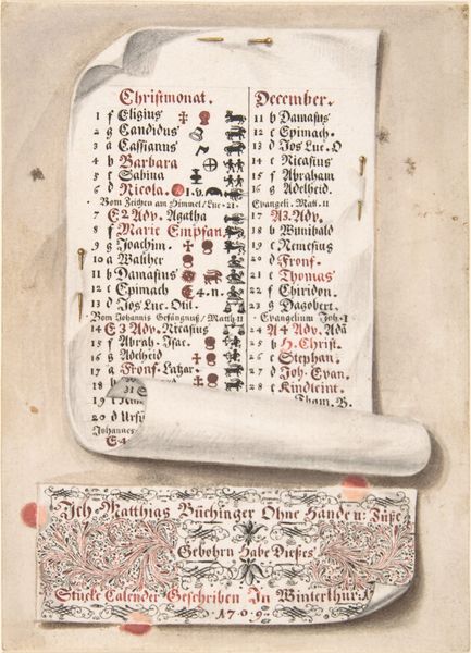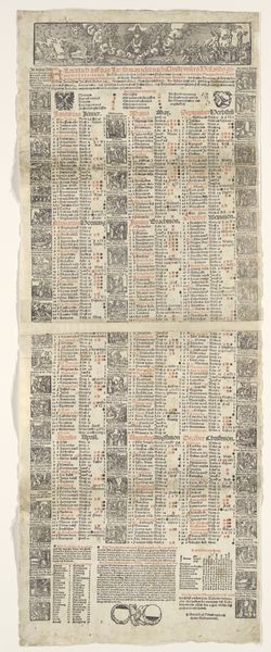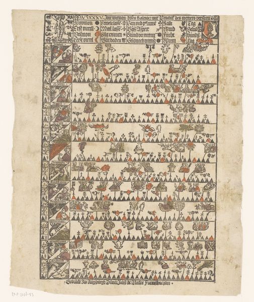 Editor: This piece is called "Wandalmanak voor het jaar 1552", from 1552. It's unattributed, so made by an anonymous artist. It's a mixed media work: a drawing using watercolor over engraving, woodcut and print. I find the grid format really striking. It seems both very orderly, and then when you look closer, it feels pretty chaotic with the mix of text and illustrations. What jumps out to you when you see this? Curator: What immediately grabs my attention is how this calendar, a supposedly objective tool, is laden with cultural and religious assumptions. Consider the very top – a depiction which seems to judge different human “types.” Editor: Different "types?" Like, professions, or social classes? Curator: Perhaps, but look closer. Who benefits from these visual representations? Who is implicitly deemed virtuous, and who is marked as other, perhaps even dangerous? We need to ask: How does this calendar function not just as a marker of time, but as a subtle enforcer of social norms and hierarchies? The images are hand-colored too, drawing attention to the most salient, or propagandist elements. Editor: So, it's more than just a calendar... it’s also reflecting and maybe reinforcing power dynamics? It's interesting to think about how something so functional can also be so political. Curator: Exactly. Think about who was literate, who had access to this, and whose narratives were privileged in its creation. What does this tell us about early Northern Renaissance society, about the relationship between knowledge, power, and representation? The images, choice of colors and text placement become loaded with meaning when viewed through a critical lens. Editor: That makes me see it in a totally different light. I was focused on the design, but you've highlighted the layers of social commentary embedded in something seemingly straightforward. Curator: It's in that tension, between the mundane and the ideological, that the artwork truly speaks. Editor: Thank you. I’ll be thinking about that for a while!
