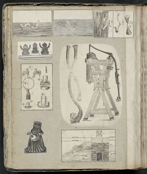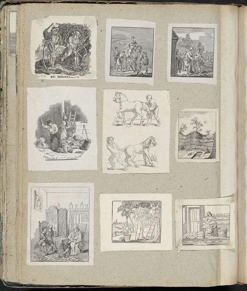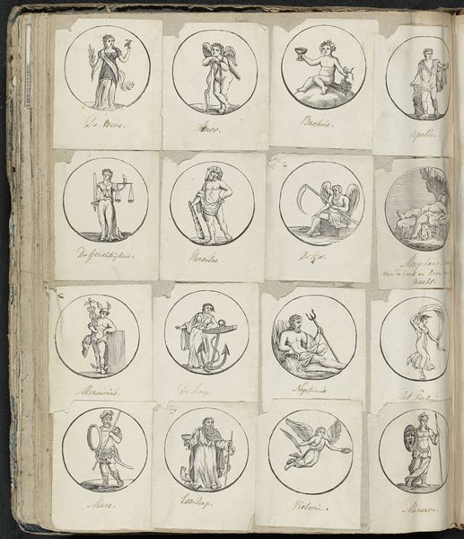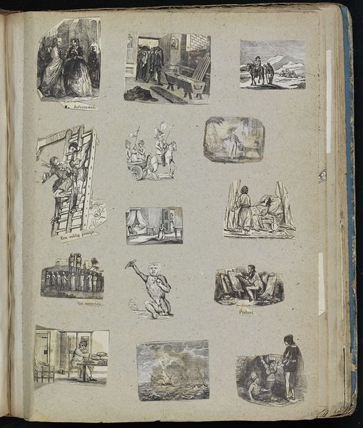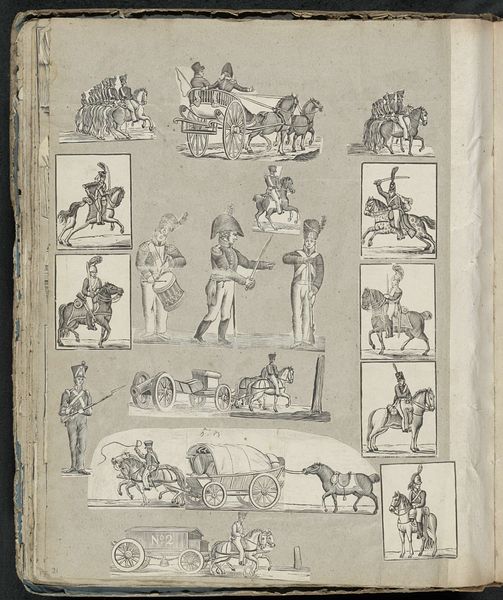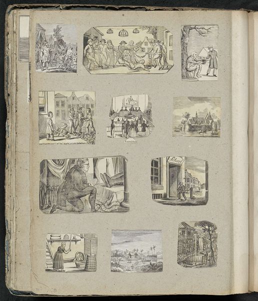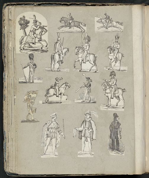 Editor: This is “Albumblad met diverse voorstellingen,” a drawing from sometime between 1814 and 1869 by Alexander Cranendoncq. It’s an assortment of pen and colored pencil sketches on paper, currently held at the Rijksmuseum. It almost feels like a sampler of different scenes and figures. What's your initial reaction? Curator: It does, doesn't it? For me, this work really exemplifies the Romantic period's fascination with capturing diverse facets of human life and narratives. You see genre painting, historical themes and figuration represented, almost like vignettes of different stories. How do you think these varied subjects speak to the social context of the time? Editor: Well, I see some that might represent daily life or even folklore… is it that Romanticism wanted to capture every aspect of life, from the mundane to the spectacular? Curator: Precisely. It was an era when national identities were solidifying and museums were becoming more public. Consider how displaying such varied images—genre scenes, historical figures, narratives—within a single album reflects a desire to create a kind of portable, personal museum. What kind of a collector would create or own something like this? Editor: Someone really curious? Like, someone wanting to know everything. And were albums like this common? Curator: Indeed. Albums like this circulated widely among the educated middle class. They speak to how people were consuming and categorizing visual information. Consider, for instance, the potential politics of including certain racialized figures among otherwise European subjects. What statements could the artist be making? Editor: Wow, I hadn't considered that aspect. It's more than just a scrapbook; it’s making some kind of statement about the world and the way things are seen. Curator: Absolutely. And understanding the social forces that shaped the imagery gives us much more context, to understand its role within a very specific historical perspective. Editor: I'll definitely look at these collections with different eyes now! Thanks for the insight. Curator: My pleasure. Recognizing the context, and politics, can transform how we understand not only these images, but museums as cultural institutions themselves.