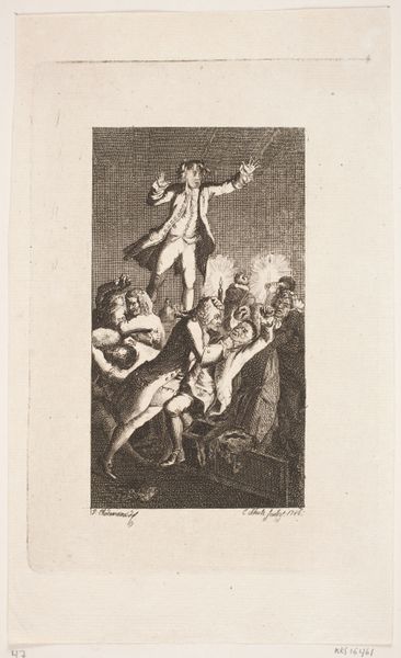 Léon Davent's "Vrouw geeft een man te drinken uit een emmer, mogelijk Eliëzer en Rebekka," made sometime between 1540 and 1556, presents us with a bustling scene rendered through intricate lines and delicate shading. The composition, shaped by an arch, directs our focus to the central figures: a woman offering water to a man, possibly Rebekah and Eliezer. The artist uses line and form to convey a sense of classical grace and movement. The tight clustering of figures, and the contrast between light and shadow, creates a dynamic rhythm that enlivens the entire print. Davent, working within the Mannerist tradition, destabilizes the classical harmony of the Renaissance by employing a complex arrangement of bodies and a certain elongation of forms. The scene can be decoded through the visual language of its time, where gestures and poses carried symbolic weight. Davent's work prompts us to consider how even seemingly straightforward images are constructed through a web of cultural codes and artistic conventions, inviting us to question fixed meanings and engage in a continuous process of interpretation.