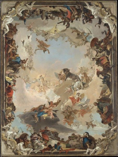 Curator: This is Henryk Siemiradzki’s “Aurora, plafond project,” dating back to around 1886. Note how Siemiradzki uses oil paint to capture this allegorical scene with figures and vibrant storytelling, seemingly ready for placement on a grandiose ceiling. Editor: My first impression is that it's… dreamy, almost aggressively so. The pastel palette and the swirling brushstrokes create this ethereal atmosphere, like a glimpse into a mythic realm. It’s not necessarily a serene dream, though; there's a dynamism in the composition, a feeling of constant movement. Curator: I agree, the dynamism certainly mirrors its historical context within late 19th-century academic painting, during which artists explored classical subjects with a renewed emphasis on dramatic effect. Considering the sociopolitical climate of partitioned Poland under Russian rule, the artist might have been invoking the hope symbolized in the dawn after a long, dark night, particularly given the figure of Aurora as a bringer of hope and promise. Editor: Absolutely. Looking at the arrangement of the figures, the upward thrust of Aurora and her horses against the reclining figures below... it’s an ascension, isn’t it? The lighter colors above contrasted with the darker earthier tones at the bottom work in conjunction to reinforce this sentiment of spiritual rising. The light catches every muscle in those horses! Curator: Consider also the inclusion of the rooster, an ancient symbol linked to the coming dawn and new beginnings—the artist skillfully employs these allegorical elements to enrich his narrative and possibly instilling patriotic sentiments in a subtle visual language of resurgence and resilience. How does the composition lead you to see this narrative expressed from your angle? Editor: Well, dissecting the composition structurally, that diagonal line established by Aurora's chariot splits the canvas. The earthly realm with its muted palette occupies the lower half, full of figures with what appears to be classical aesthetic qualities—and is separated from this more airy, idealized realm above through contrasting chromatic choices, as we've mentioned. Siemiradzki guides our eye heavenward to something new and perhaps more glorious through light, color, and symbolic orientation. Curator: Indeed, viewing “Aurora, plafond project” through a multifaceted lens reveals how intertwined artistic expression can be with socio-political aspirations. The artist encourages us to consider history, myth, and the enduring human hope for liberation and better days. Editor: From a formal perspective, focusing on brushstrokes, the mastery lies in rendering these ephemeral figures and creatures through pure painterly effect. These visual choices heighten our sensory perception of beauty, even grace within this optimistic promise represented through Siemiradzki’s unique visual idiom.