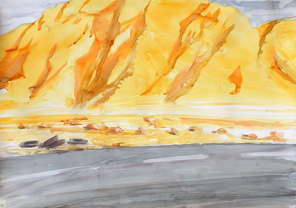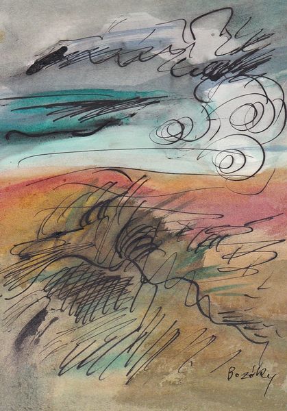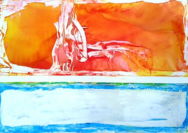 Curator: Well, this is interesting! My initial impression is…warmth. There's a sun-drenched quality to the whole composition that feels undeniably optimistic. Editor: We are looking at "Sunday Afternoon" created in 1969 by Ronnie Landfield. It’s a watercolor work. Landfield was working at the height of the Abstract Expressionist movement and, interestingly, the dawn of second-wave feminism. It raises questions of domesticity and leisure viewed through a modernist lens. Curator: Ah, context is everything! I can see that now. There is a palpable dialogue happening here. The amorphous forms seem to gesture at both the natural world and at personal emotion. The horizontal division grounds it, gives it stability, almost like domestic life, but then those wild color washes challenge it. It feels like a negotiation. Editor: The tension is certainly present, isn’t it? Look at how Landfield applies the watercolor. There is a semiotic play here in color, form, line, and composition: horizontal lines signify stability and calm, contrasting with freely expressed form to convey dynamic change. Also, white curves disrupt it! I think Landfield offers up space to viewers through such visual language to construct one's meaning. Curator: Absolutely! But even that perceived optimism, that "warmth", now feels complex. It’s filtered through societal expectations of gender, of what a “Sunday Afternoon” *should* be for some folks during that period, or whose perspective are we seeing. Whose afternoon is being expressed? This abstraction seems deeply rooted in very real social dynamics. It seems his style here really plays to highlight or suggest some underlying unease beneath idyllic veneer. Editor: It's a persuasive reading of the social backdrop. Visually, those dynamic contrasts create interest while also leaving space for interpretation—perhaps intentionally? This allows us to come back again and again while opening ourselves to change. Curator: Precisely. It speaks volumes about his artistic choices while speaking back to his culture as a commentary. This simple watercolor becomes surprisingly profound upon closer look.