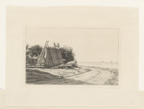 Curator: Let’s take a look at Fredrik Theodorus Grabijn’s “Duinlandschap met wandelaar,” or “Dune Landscape with Walker.” It’s a pencil drawing dating from sometime between 1871 and 1937, currently held at the Rijksmuseum. Editor: It’s very still, quiet. A hazy sort of light and the delicate graphite work contribute to an atmosphere of peaceful solitude, a solitary figure captured amidst a tranquil scene of land meeting sky. Curator: I think that quietude is crucial. Think about the role of drawing, the artist using graphite, a relatively inexpensive and accessible material to capture the subtleties of light and atmosphere in the Dutch landscape. Editor: It’s not just the graphite but also the artist's ability to convey volume through varying densities of line. Observe how the tree groupings gain mass. This suggests the hand is skilled, even as the medium stays deliberately humble. What do we make of this artistic choice in rendering the Dutch landscape? Curator: Well, the Dutch landscape tradition, even in painting, often intertwined with national identity and emerging notions of working-class identity. The accessibility of drawing—of depicting that landscape without opulent color—allows, maybe even demands a certain closeness to it. Think about accessibility and labor in creating the artwork. Editor: That's fascinating when thinking about this single figure—almost an observer—existing on the periphery, but undeniably rooted in the locale, her place defined by work and belonging. There are few emotional displays within the composition. Curator: Precisely. It avoids romanticizing labor. This feels far more akin to a documentary impulse that we see mirrored in artistic collectives growing throughout that period, challenging dominant aesthetic modes. Editor: Indeed, and one finds resonance between such minimalist form and subtle content. It makes me reconsider what I initially viewed as the art's muted aesthetic impact! Curator: For me, Grabijn’s decision emphasizes that close, careful attention reveals greater social meanings hidden beneath its humble simplicity. Editor: Thank you; with that new social and artistic understanding, my experience and deeper awareness of Grabijn's delicate "Duinlandschap met wandelaar" changed from simply admiring craft to realizing complexity in it.