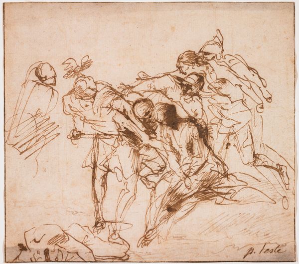 Curator: The artwork before us, created by Carlo Maratti around 1650 to 1700, depicts "The Flagellation of Christ" in ink on paper. It is currently housed at the Art Institute of Chicago. Editor: It's immediately striking how raw and energetic this drawing is. The figures seem to emerge from a flurry of lines. There's a brutality conveyed in its chaotic composition, but there's a clear dramatic emphasis on the suffering of Christ. Curator: The composition, typical of Baroque art, is meant to evoke emotion through movement and drama. Maratti skillfully uses the medium of ink to suggest texture and form with simple economical gestures, particularly in Christ’s tortured pose and musculature. Editor: Indeed, but looking beyond the art object, this image and scene were made for specific socio-political intentions. The representation of Christ's suffering had deep roots in the history of Europe—specifically after the Council of Trent. Powerful religious artworks like this encouraged pious sentiment among the public and reinforced Catholic teachings and authority. Curator: An interesting point, of course. One might also look at how the artist exploits contrasts to emphasize his subject: the dynamism of the flagellators versus the resigned suffering of Christ. Note too, the use of negative space to highlight Christ's figure. It is through these devices that the artwork compels an emotional response. Editor: And one could argue that the effectiveness of those devices depends heavily on how well they support the prevailing theological message that underpinned the imagery. These visual depictions helped the Catholic church deliver its spiritual lessons. Without a specific context, does it achieve the intended emotional response of the viewer? Curator: Whether it achieves the "intended response," I suppose, depends on each individual's personal interpretation. As viewers, we react subjectively, yes, but our attention is channeled by Maratti's deliberate structuring of the visual components. Editor: Certainly. When studying the visual impact, it would also be essential to explore what Maratti hoped to gain by creating works with religious context and symbolism, given the patron and political climate of that period. Curator: It seems clear from the gestural quality of this drawing that we have something of a study—the rawness, as you mentioned, creates a compelling engagement with the emotional heart of this subject. Editor: And looking at the cultural imprint, it’s a fascinating reminder that art isn't created in a vacuum; it exists within networks of power, religion, and socio-historical conditions.