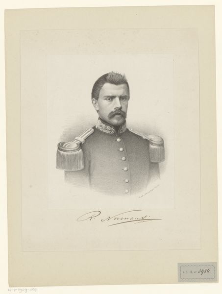 Johan Hendrik Hoffmeister created this portrait of an unknown man, possibly G. A. J. Van Hoey-Schilthouwer. The lithograph presents us with a study in contrasts between light and shadow, line and form. The composition divides the image into distinct zones. Notice the stark, empty space above the figure, a void that presses down and throws the subject into sharp relief. The man is rendered with precise, controlled lines that define his uniform and facial features. There is a clear hierarchy of detail, with the face and the buttons on the jacket receiving the most meticulous attention. The eyes, though small, are deeply set and convey a sense of solemnity. The lithographic technique allows for subtle gradations of tone. This creates a textural effect, especially in the rendering of the beard and hair. This interplay of detail and abstraction invites us to consider the semiotic function of the portrait. Is it a celebration of military authority? Or a more nuanced exploration of individual identity within the rigid structures of 19th-century society?