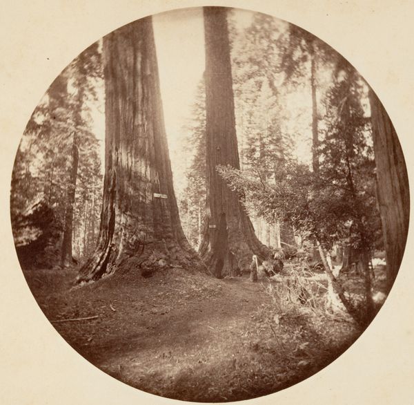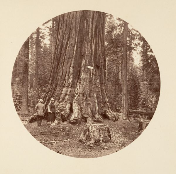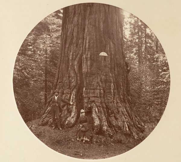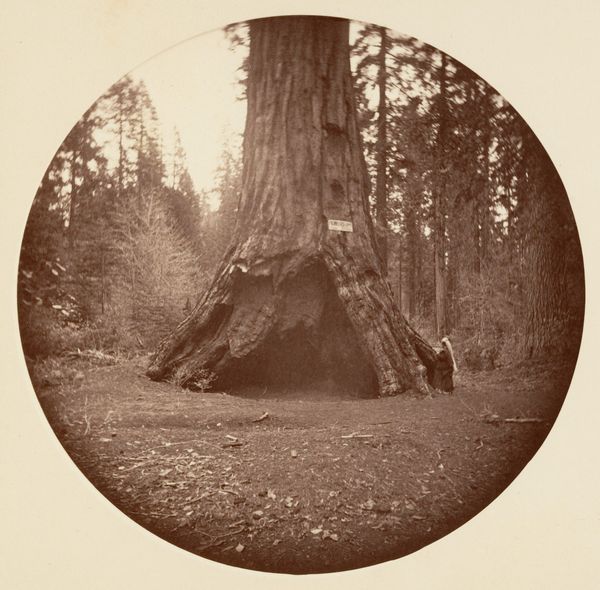 Editor: Here we have Carleton Watkins' "Pioneer's Cabin", a gelatin-silver print from between 1865 and 1866. There's such an unusual pairing of immense scale with what feels like intimate domesticity, what do you make of it? Curator: It’s fascinating how Watkins uses photography to participate in shaping the American West, isn't it? Consider the socio-political context: the 1860s was a time of westward expansion and Manifest Destiny. Watkins’ photographs, including this one, weren't just documentation. They actively promoted settlement and tourism, and they really shaped the *perception* of California’s natural wonders. Editor: So it’s more than just a pretty picture? How so? Curator: Absolutely. Think about the title itself, "Pioneer's Cabin." It evokes a narrative of human dominion over nature, doesn't it? This giant sequoia, made to look like a welcoming home...It almost hides the actual, disruptive impact of settlement on indigenous populations and ecosystems. The placement of the chair also suggests a tamed space. What is suggested by this? Editor: That's thought-provoking. I hadn't considered the role it played in shaping perceptions. I was simply focused on the technical achievement and aesthetic qualities, its realism. Curator: The very act of photographing these landscapes, disseminating the images through prints and exhibitions, reinforced the idea of America as a land ripe for the taking, almost like propaganda, no? A visual rhetoric that both celebrated and obscured reality. The public role of art in constructing national identity is quite evident here, even from 150 years away! Editor: This makes me realize the work does much more than capture what was there. Thank you. Curator: Likewise. Considering the institutional history around Watkins' photographs gives you a far richer understanding than pure aesthetics alone could.