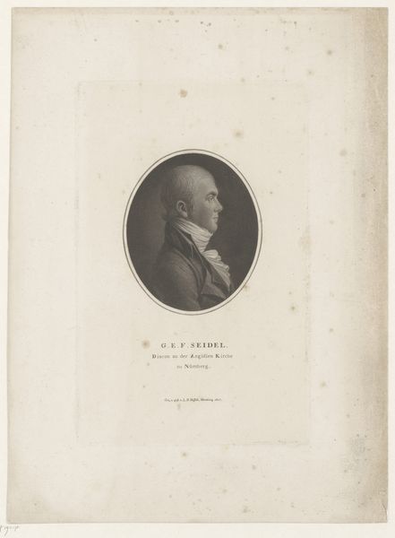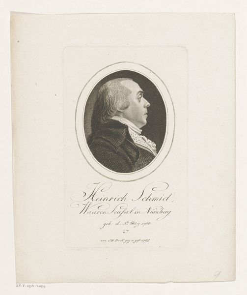 Editor: Here we have a print from 1793, a portrait of Albrecht Christoph Kayser by Christoph-Wilhelm Bock, currently housed at the Rijksmuseum. It’s a fairly simple engraving on paper, but I’m really struck by the intensity of the gaze even in profile. What can you tell me about it? Curator: Oh, intensity indeed! It’s funny, isn’t it, how a simple line engraving can convey such depth? I find these Neoclassical portraits incredibly evocative, little windows into the past. Look closely at the way the engraver used line to define Kayser's features. Do you see how much detail is actually conveyed with relatively little information? It's almost… poetic minimalism! Editor: Poetic minimalism… I like that. So, what was it about Neoclassicism that led artists to embrace such restraint in portraiture? Curator: Well, think about what came before – the Rococo period, all frills and ornamentation. Neoclassicism was a deliberate turning away from that, back to the perceived purity and order of ancient Greece and Rome. In portraiture, this meant emphasizing idealized form and character. Do you see echoes of ancient cameos in the profile and circular framing here? Editor: Yes, absolutely! And that connection to the classical world adds a layer of dignity and timelessness, doesn't it? Curator: Precisely! It's less about capturing every tiny detail and more about presenting a vision of someone of substance, someone whose qualities endure beyond the fleeting moment. Though I imagine Kayser would have had feelings about it all! What feelings do you imagine he harbored? Editor: Hmm, I wonder. The timelessness you mentioned has changed my appreciation, it almost immortalizes him through art. Curator: That's it entirely. Art for immortality – if we're lucky!