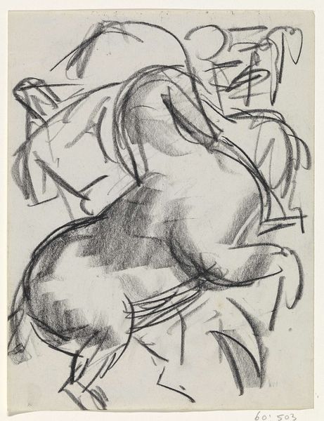 Curator: Let’s turn our attention to a drawing by Max Beckmann from around 1916-1917 titled "Fridel Battenberg auf dem Sofa sitzend (Karikatur)". It's charcoal and chalk on paper. Editor: The caricature aspect immediately grabs you, right? It has a dejected mood, yet something about the simplified lines makes it hard to look away. Curator: It's definitely a caricature, but an intimate one, don’t you think? We see her on the sofa with her face propped up by one hand. What do you think this informal, pared-down method expresses? Editor: Maybe it speaks to the context of wartime, given the date. There is an unposed quality, she seems melancholy, worn down. We see vulnerability without the mask people often put on. Perhaps that is how the war showed itself behind closed doors, a collapse into one's inner feelings. Curator: It could well point towards a shift in artistic intention following the war. Beckmann turned away from external concerns. He started observing figures close to him as a way to observe himself in a way. There's almost a brutal honesty to how he captures her. It’s quite raw. Editor: I find it almost unflattering, actually. It's as if we are invited to witness a very private moment, but also with an implicit criticism of how wealthy bourgeois women, like Battenberg, occupied their time. Sitting around is so different from fighting for survival during those years. Curator: Interesting. You're viewing her almost as a symbol of a privileged class? I tend to view her state more broadly, reflecting that sense of disillusionment prevalent among all echelons of society. Perhaps it's about loneliness more than leisure. Editor: Well, art is so evocative because multiple interpretations can all exist! Curator: Precisely, which makes it worth engaging with. It gives us something to think about regarding a moment in time, class and personal affect. Editor: Indeed, a small sketch that holds multitudes.