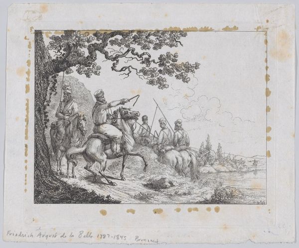 Curator: This etching by Carle Vernet, titled "A Cossack," dates to around 1820. The artwork, rendered in ink on paper, presents a dynamic, if somewhat romanticized, vision. What are your initial thoughts? Editor: Immediately, I'm struck by the quality of the line work. There’s such an intense laboriousness to capture movement; every contour describes form and force simultaneously. You feel the horse is about to leap off the page. Curator: Absolutely. Vernet’s portrayal taps into the period's fascination with the Cossacks, particularly their role in the Napoleonic Wars. They became a symbol of resistance, yet were equally constructed by European imagination, their image deployed as emblems of either savagery or nobility. Editor: Interesting, that romantic view definitely influenced his use of lithography. Etching, like many other mediums, demands particular tools, specialized knowledge. How does that context shape the availability and circulation of this piece, considering it likely reaches a market captivated by that image? Curator: It speaks to a broader circulation of images tied to specific geopolitical contexts. Consider, too, the performance of masculinity within this portrayal. The Cossack's dress, the weaponry, his upright posture-- it's all carefully constructed visual rhetoric emphasizing strength, valor and independence during an era where ideas of empire and identity were aggressively contested. Editor: It also brings forth issues of orientalism, I see what you mean about these ideas aggressively shaping production. Vernet is definitely showing, but also arguably shaping this ideal of what it is. But the choice of using a lithograph makes a difference. This method allows more detailed depiction for easier consumption but also for control during reproduction. What is your understanding of how Vernet was processing materials? Curator: Right, it underscores how vernacular imagery circulated to shape popular discourse regarding power. These weren't innocent depictions. They were strategically deployed visuals influencing policies on international stages. I feel this reading of "A Cossack" urges us to delve deeply into power's portrayal through artistic expression. Editor: It certainly pushes me to examine how these images became commodities—bits of material contributing to much larger ideologies and policies, and how the labor to do so, really matters.