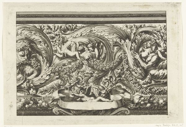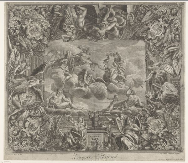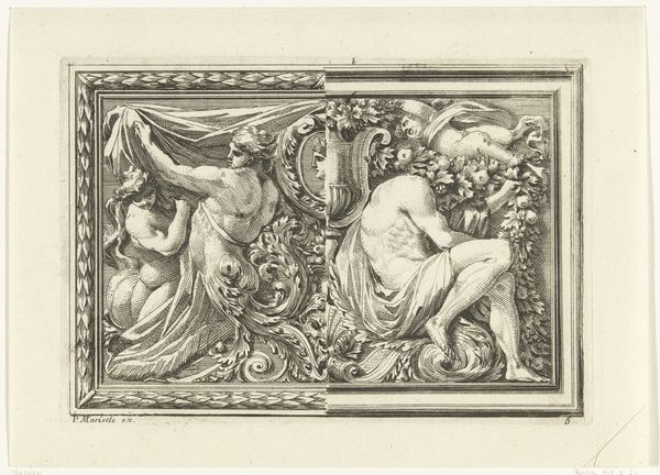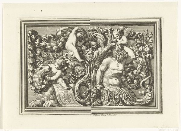 Susanne Maria von Sandrart crafted this panel with a round medallion, showcasing a wealth of classical motifs. At its heart, a figure reminiscent of Jupiter hands a shield to a smaller figure who may be interpreted as Mars, thus evoking themes of divine authority and martial power. These motifs are framed by putti, symbols of innocence and love, and a figure of Abundantia, who holds a cornucopia, and a laurel crown, emblems of prosperity and triumph. The sphinxes at the base, which represent wisdom and mystery, are recurrent in ancient Egyptian art. Observe how such symbols migrate across time, resurfacing during the Renaissance, imbued with renewed classical significance. The image is designed to stir feelings of nostalgia and grandeur, as we find echoes of ancient virtues and ideals, demonstrating the cyclical nature of cultural memory.