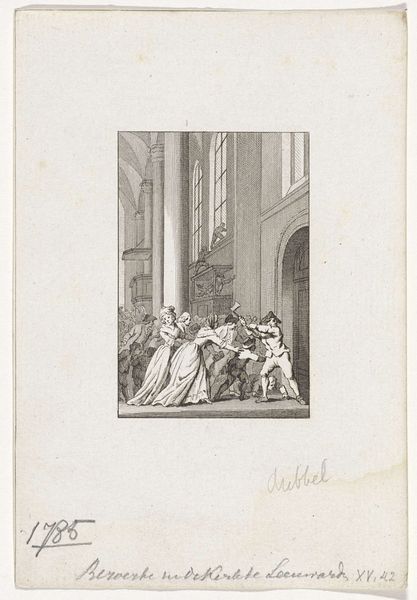 Editor: Here we have Reinier Vinkeles’ engraving, "Terechtstelling van burgemeester Cornelis van der Burgh te Leeuwarden, 1789," created between 1783 and 1795. It’s a stark depiction of a public execution. What do you see in this piece from a formal perspective? Curator: Observe the artist’s deployment of line and contrast. Vinkeles orchestrates a scene using precise, delicate lines, constructing an unsettling equilibrium. Consider the stark contrast between light and shadow, emphasizing the brutal event’s core: the executioner, Van der Burgh kneeling, all rendered in an architectural tableau. The buildings define a picture plane adding spatial complexity and directing our gaze toward the brutal focal point. Editor: It is visually quite powerful! The composition does guide you to focus on the execution itself despite the broader cityscape. The building becomes like a stage. What about the distribution of the crowd, and their composition? Curator: Notice that Vinkeles creates rhythm and texture to the picture's form, placing dark strokes in certain ways to portray the human reactions. Observe the arrangement of their heads – how they create almost a patterned surface across the bottom third of the picture plane. Do you perceive a distinction in the treatment between the group and single individual's depiction? Editor: I see what you mean! The individual's at the stage have crisp distinct lines while those in the audience are scribbled! Are they supposed to represent movement or noise? Curator: The treatment enhances the tension. Consider it also within the picture's structure of line density and arrangement: the stage versus the crowd adds layers, with depth of space. These patterns contribute meaning and structure into your overall comprehension of this piece and that heightens tension that's taking place within it. What would you say? Editor: It is an intricate visual strategy used here, indeed adding the atmosphere to it all, a blend of emotional responses and formal arrangements of patterns. Thank you. Curator: Certainly. Analyzing these elements gives insight. Always look closely into how the artwork functions from it's structures on to deeper comprehension of your individual interactions of history, knowledge of culture from the structure, the visual construction by forms, techniques, patterns etc! These insights, allow one an artistic viewpoint!