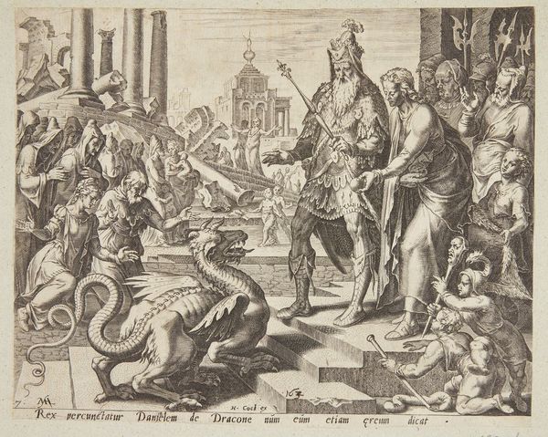 Curator: This is Pietro Aquila’s etching, "Sacrifice of Polyxena." Note its sharp lines. The artist lived between 1650 and 1700. Editor: There's such a stark contrast between the rigid formality of the figures on the left and the almost theatrical violence about to unfold on the right. Curator: Aquila, as an engraver, disseminated images. Polyxena's story—the Trojan princess sacrificed after the war—had a specific cultural resonance. The artwork's purpose was to promote certain values. Editor: Indeed. The power dynamics are brutal. Polyxena is offered up as a prize, a spoil of war. It reflects a patriarchal view of women as disposable commodities. Curator: The composition invites us to consider the consequences of war, and how the victors consolidate their power. The architectural details on the left serve to ground the scene in a specific classical setting. Editor: The angel shielding Polyxena’s eyes almost normalizes the violence as divinely sanctioned. The male gaze here is palpable and unsettling, even centuries later. Curator: Precisely. Aquila's work can be read as a lens through which to examine social and political structures. Editor: A powerful reminder of how art can both reflect and reinforce the status quo.