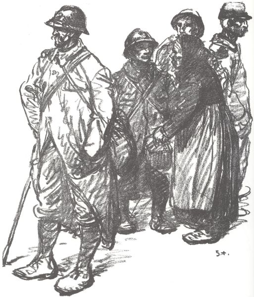 Curator: "Home Again," an etching by Arthur Lismer, dating back to 1919. Editor: It has a somber mood. I find the stark contrast in light and shadow quite effective. The upward gaze somehow makes you wonder about the scene beyond. Curator: Lismer made this print following his time as an official war artist. It captures the moment soldiers returned to Canada after the First World War. What does that detail add to your interpretation? Editor: Well, it enriches my reading of the soldiers' expressions. It does make it less somber, yet also tense. There is anticipation, with these bold pen strokes conveying this subtle combination of joy, relief and possibly trauma. What about the faceless figures in the background? Curator: Their position adds a sense of community. It's not just individual homecomings but a collective one, reflecting Canada's experience after the war. Lismer was committed to illustrating Canada's emergence as a nation after the war, distinct from its colonial ties to Britain. The medium is especially powerful here. Don't you agree? Editor: The choice of etching is excellent! It lends a gritty realism appropriate for a scene of returning soldiers. And yes, it brings a certain authenticity to the faces. You notice the artist did not bother to add details in the top rows, focusing our attention instead on the foreground figures. The gaze. It is almost hopeful. Curator: Knowing Lismer's position helps one appreciate how this piece resonates beyond individual emotion to make a comment about national identity. Thank you! It has made me appreciate a facet I wasn't fully aware of. Editor: Likewise! The context adds a deeper meaning to the composition, creating such a nuanced story!