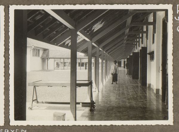 Curator: Here we have an intriguing vintage photograph from around 1929 titled, "Interieur met boksbal van een gebouw van Schule Schloss Salem". Editor: It’s quite stark. The high contrast and the sheer emptiness… there's an almost haunting quality to this open space. Curator: The artist captures an interior view marked by strong horizontals and verticals—beams and support columns which are arranged with what looks like modular precision, but disrupted by an incongruent sphere. Editor: Right, and that sphere disrupts more than just the pattern. Hanging there in the middle, it immediately sets up a contradiction with its surrounding structure: softness versus rigidity, aggression and violence amidst what looks like an academic building. Considering the time period, it does bring up associations of looming conflicts and the violence inherent to institutions. Curator: The beauty of the photograph lies partly in this tension. Note how the wooden architecture gives the impression of organic design, contrasted with that single hanging punching bag. Editor: True. It might serve to highlight the ways individuals both reinforce and resist institutional authority—an implicit critique given Schule Schloss Salem’s later association with the Nazi regime despite its progressive aims initially. Curator: Well, seen purely as a visual composition, it masterfully captures light and shadow to evoke the building's spaciousness. Notice the subtle gradations that invite you into the vast interior space. The photographic technique and perspective also are impeccable. Editor: While the photographic technique undeniably displays formal skill, I still find that the true power rests in what it reflects about its context—the latent aggression, the contradictions. For me, it's hard not to bring that lens when analyzing it. Curator: And I remain captivated by the ways in which this photographer crafted a unique formal aesthetic. Editor: Precisely, this photo serves as an entry point to discuss architecture and politics while prompting considerations on power and the self.