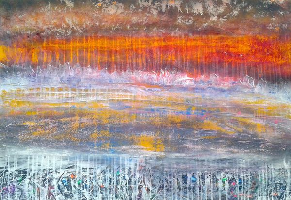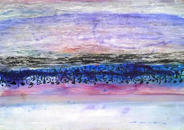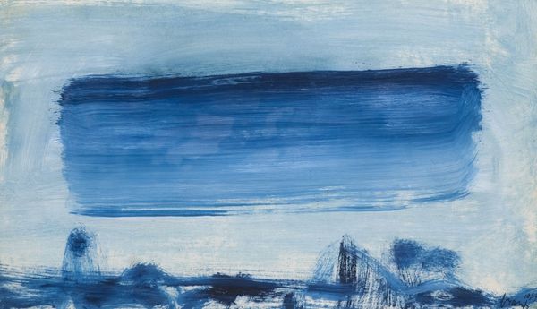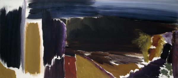Editor: This is Eugene Brands' "Dream of Reality" from 1988, made with acrylic paint, including impasto application. It has a certain simplicity. I am intrigued by the stark contrast between the dark background and the white central form, almost like a simplified, stylized bed. What strikes you most about it? Curator: The title hints at the crux of the work; 'dream of reality.' To me, Brands here isn't so much representing a subject as engaging in an investigation of the very *process* of representation, using the materiality of paint itself. Acrylic allows for a flatness and immediacy. Consider the impasto: how does this tactile quality, the build-up of the material, change the relationship to the image? It’s both present and not, a quality he’s pushing throughout the picture plane. Editor: So, rather than seeing a picture *of* something, we're meant to be aware of the material decisions, the choices that brought it into being. I hadn't considered that tactile engagement so directly. The canvas and acrylic themselves are like tools. Curator: Exactly! And the socio-economic context matters too. Brands created this post-WWII in Europe where artists sought new means of expression, engaging in this manner with the materials as resistance to older traditions. He uses very base mediums here: canvas and acrylic. Are there other makers creating paintings like this that remind you of anything we've studied this semester? How else do the material choices themselves convey meaning? Editor: Well, in some ways it echoes the gestural abstraction of the time but more… pared down. Thinking about it as a 'dream of reality,' the visible brushstrokes feel crucial because they prevent us from seeing a completely formed object. It keeps the representation elusive, always a construction. I think, I was stuck looking *at* and not understanding how much it depends on materials, production and those postwar sensibilities! Curator: Precisely, looking into the labor of image creation opens many roads into understanding. It's been enriching to connect the 'what' to the 'how' in this artwork today.